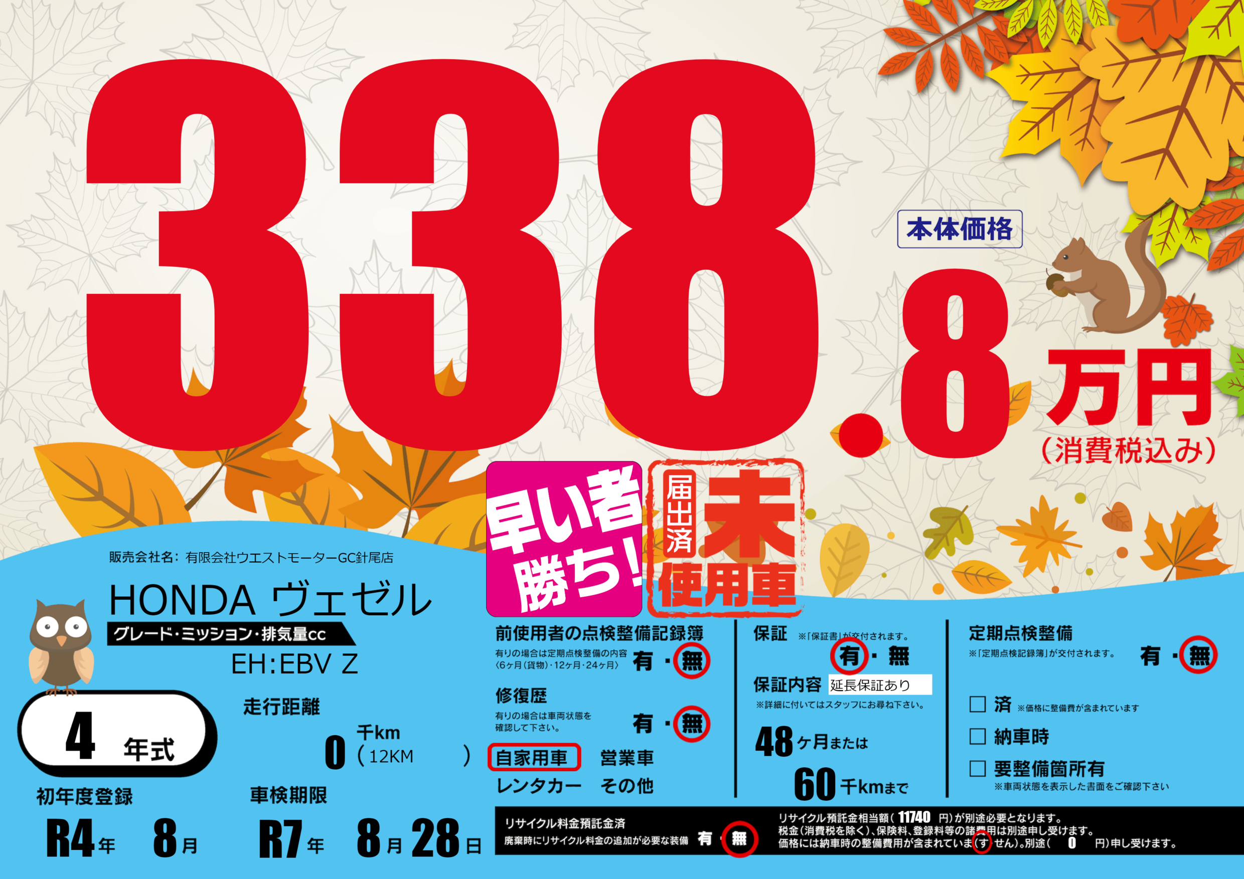 | 車名 | HONDA ヴェゼル | グレード ミッション 排気量 |