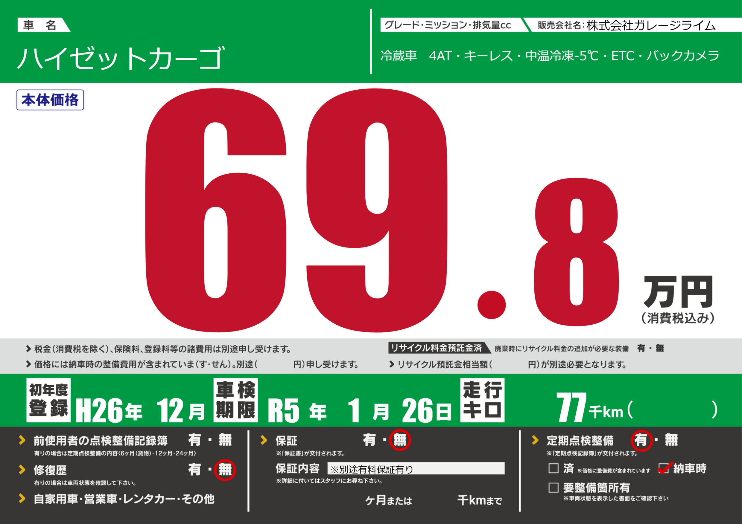 | 車名 | ハイゼットカーゴ | グレード ミッション 排気量 |