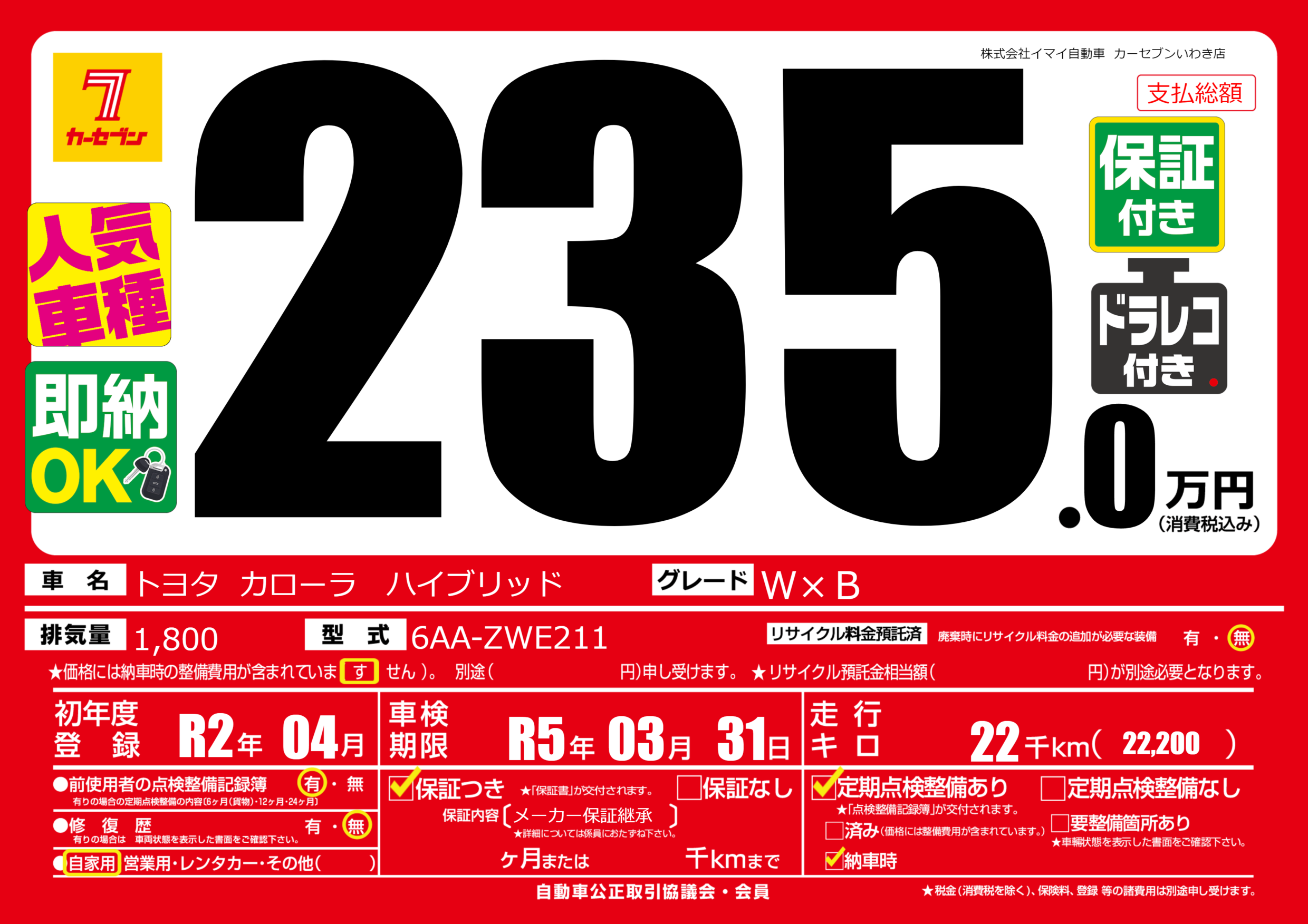| 車名 | トヨタ カローラ ハイブリッド | グレード ミッション 排気量 |