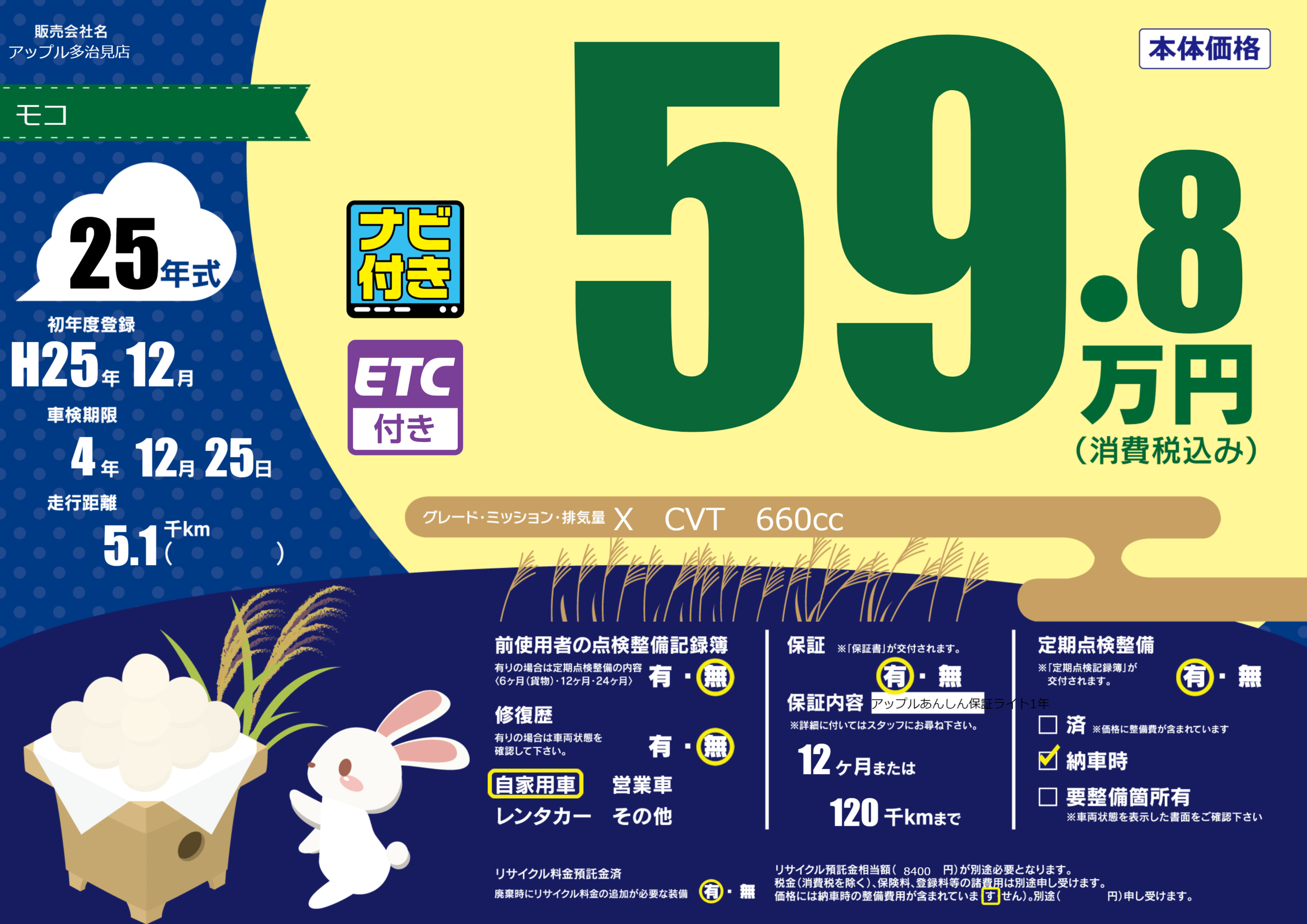 | 定期点検整備 | 定期点検整備あり 納車時あり | ||