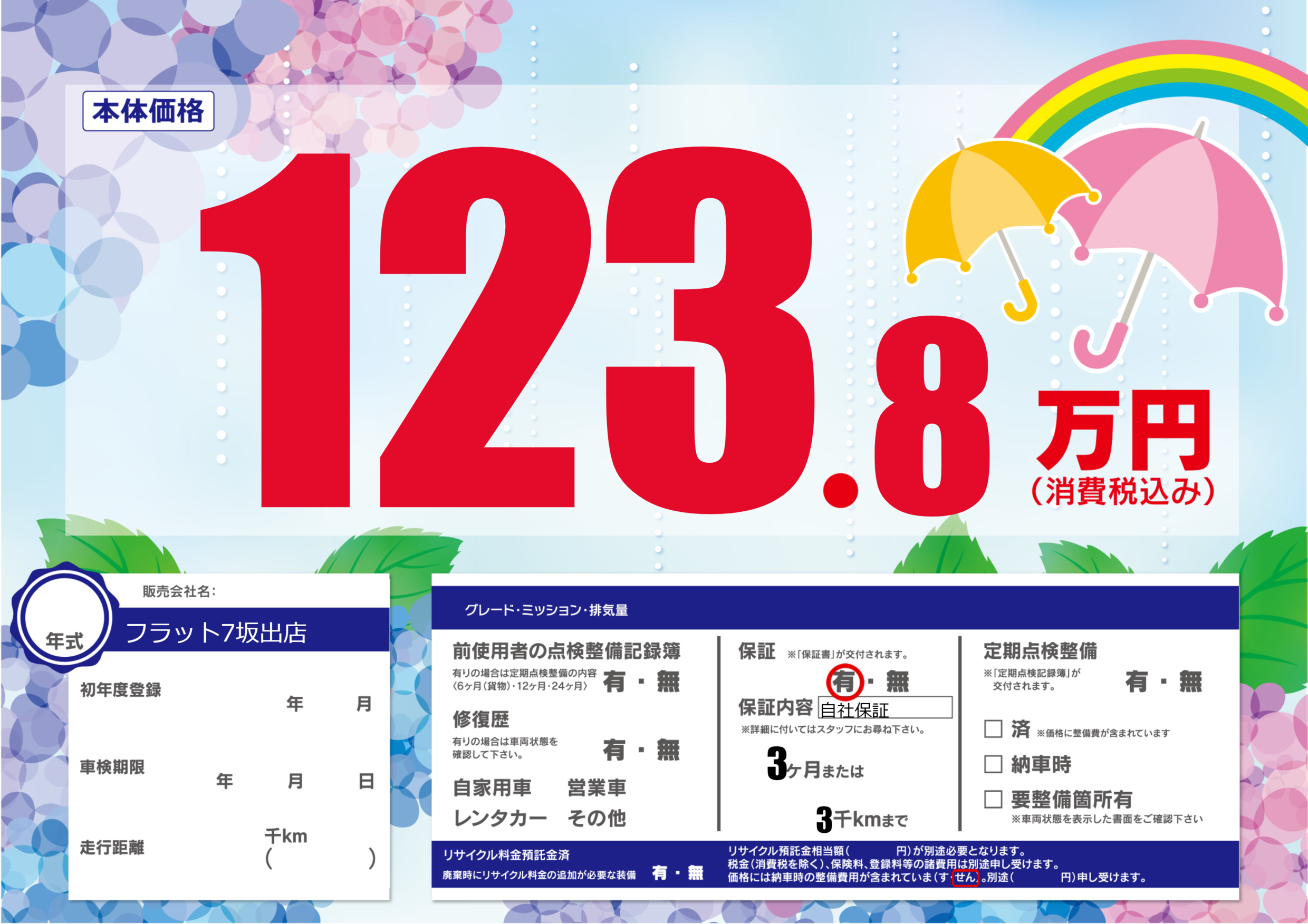 保証付き 保証内容(自社保証) 3ヶ月または(3)千kmまで |