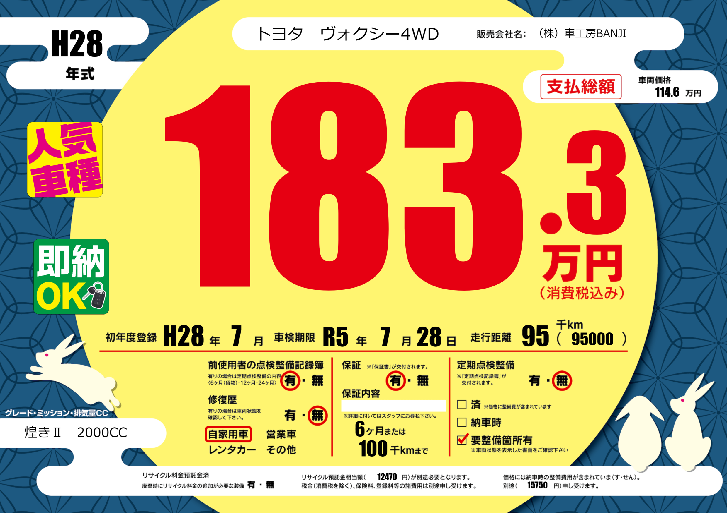 | 走行キロ | 9.5万km | 初年度登録 | H28年7月 |