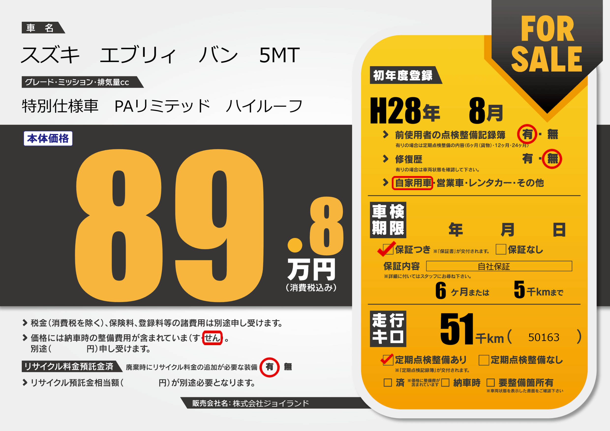 保証付き 保証内容( 自社保証) 6ヶ月または(5)千kmまで |
