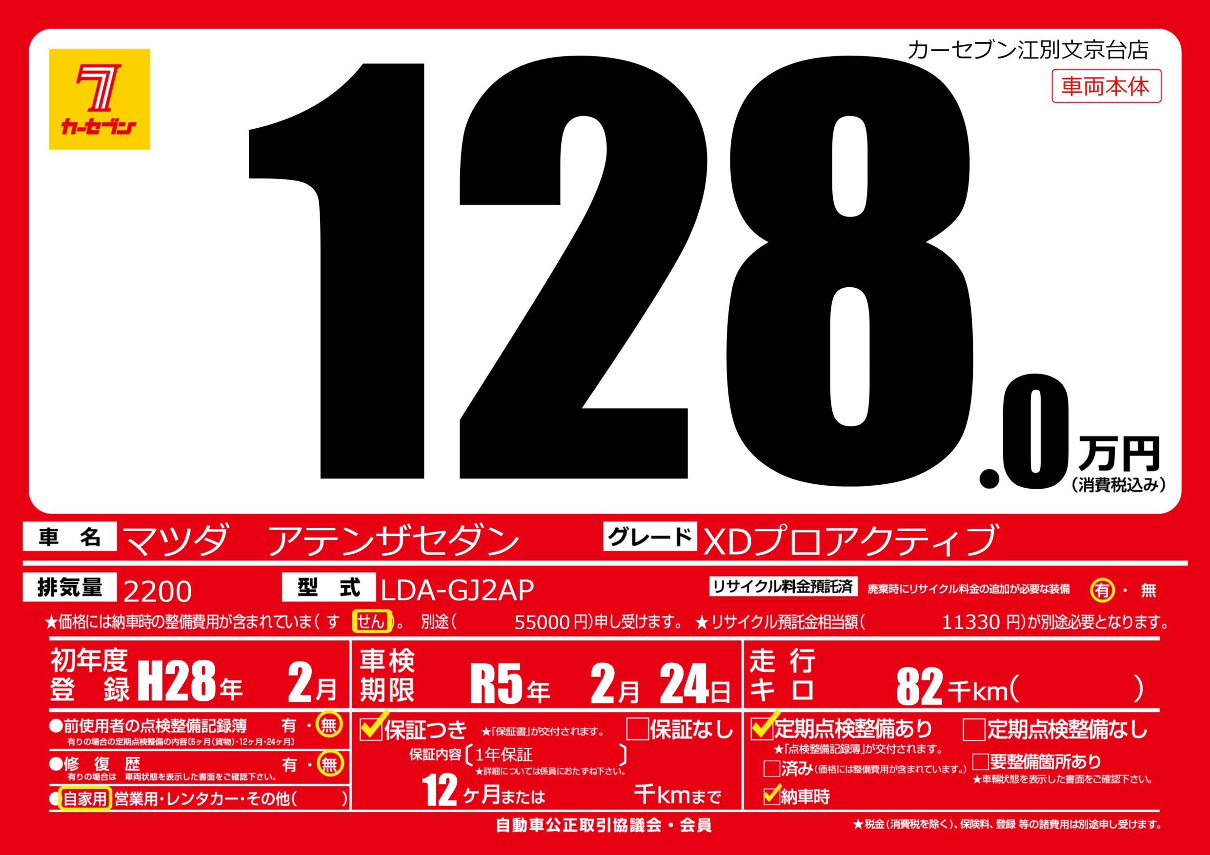 | 走行キロ | 8.2万km | 初年度登録 | H28年2月 |