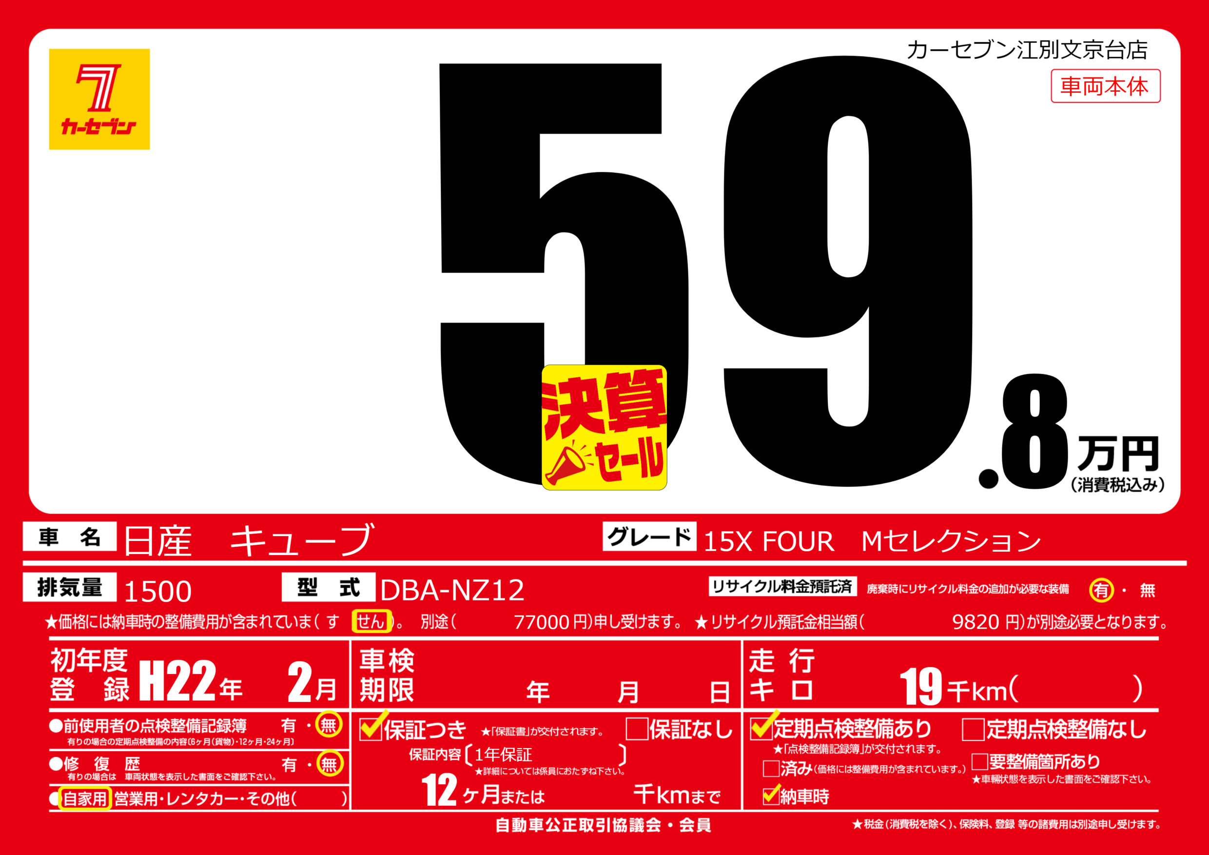 | 車名 | 日産 キューブ | グレード ミッション 排気量 |