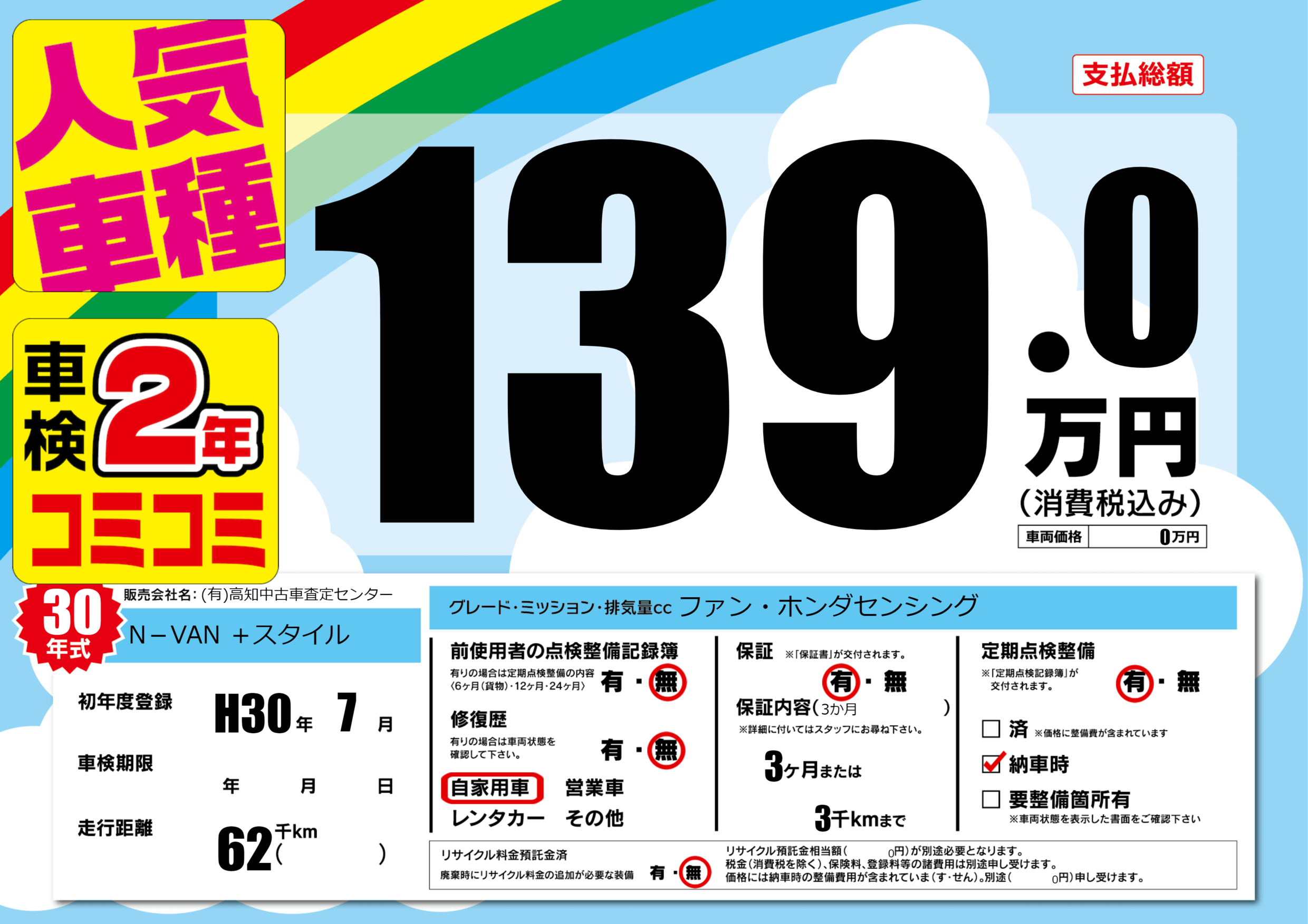 | 定期点検整備 | 定期点検整備あり 納車時あり | ||