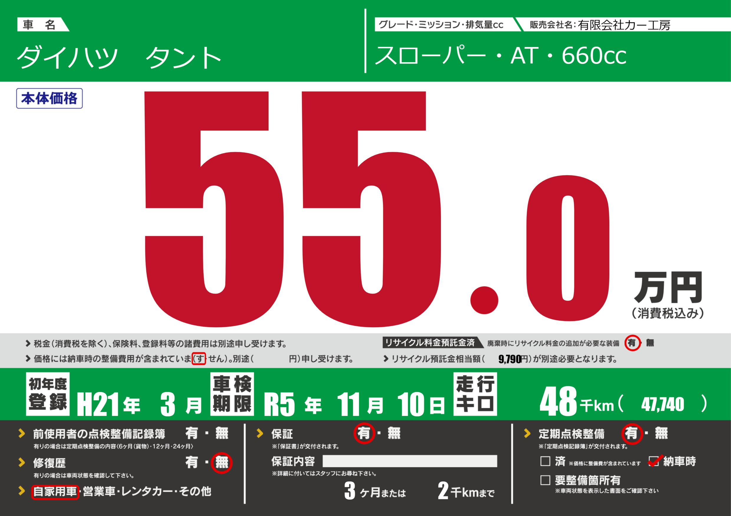 | 車名 | ダイハツ タント | グレード ミッション 排気量 |