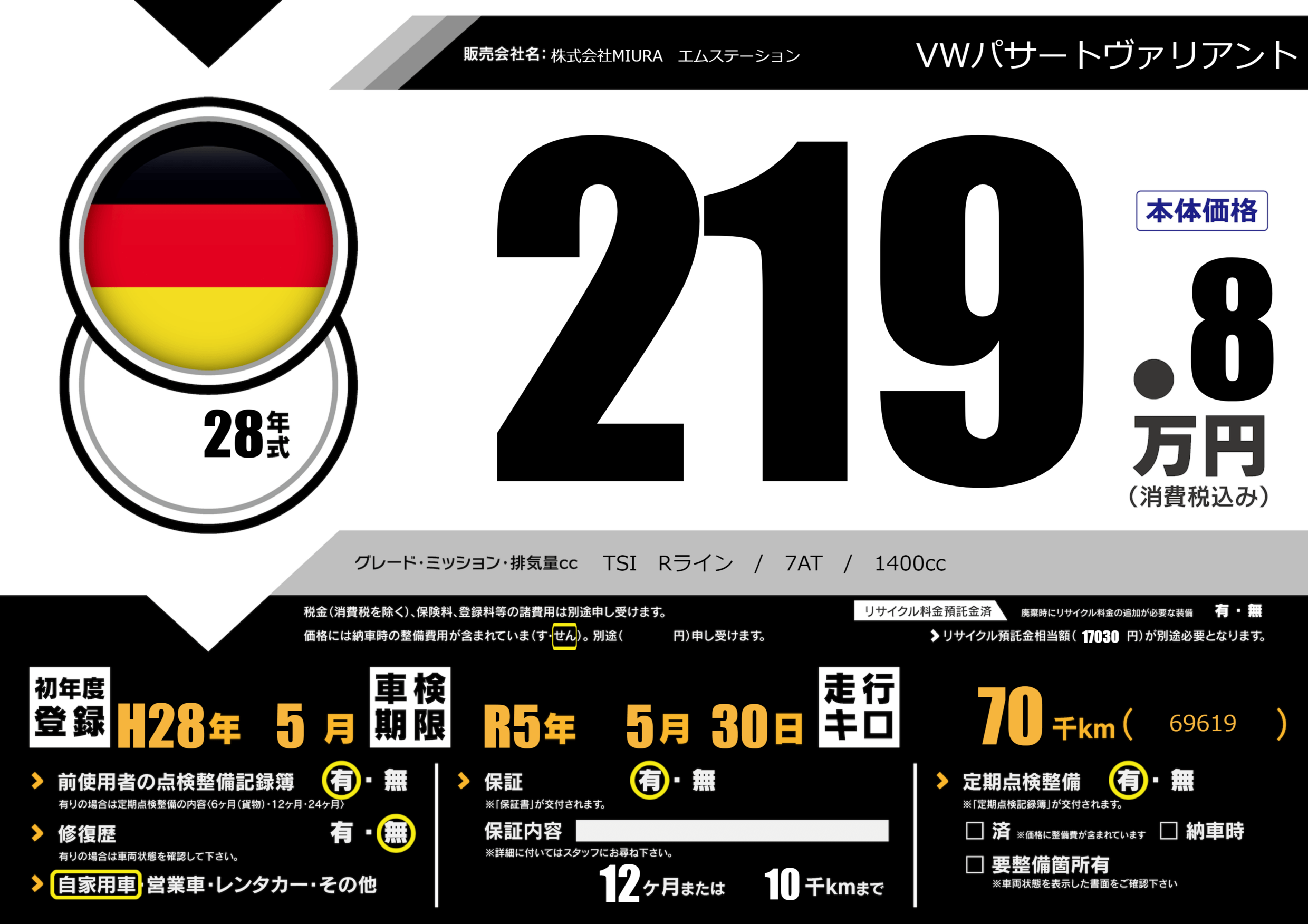 | 車名 | VWパサートヴァリアント | グレード ミッション 排気量 |