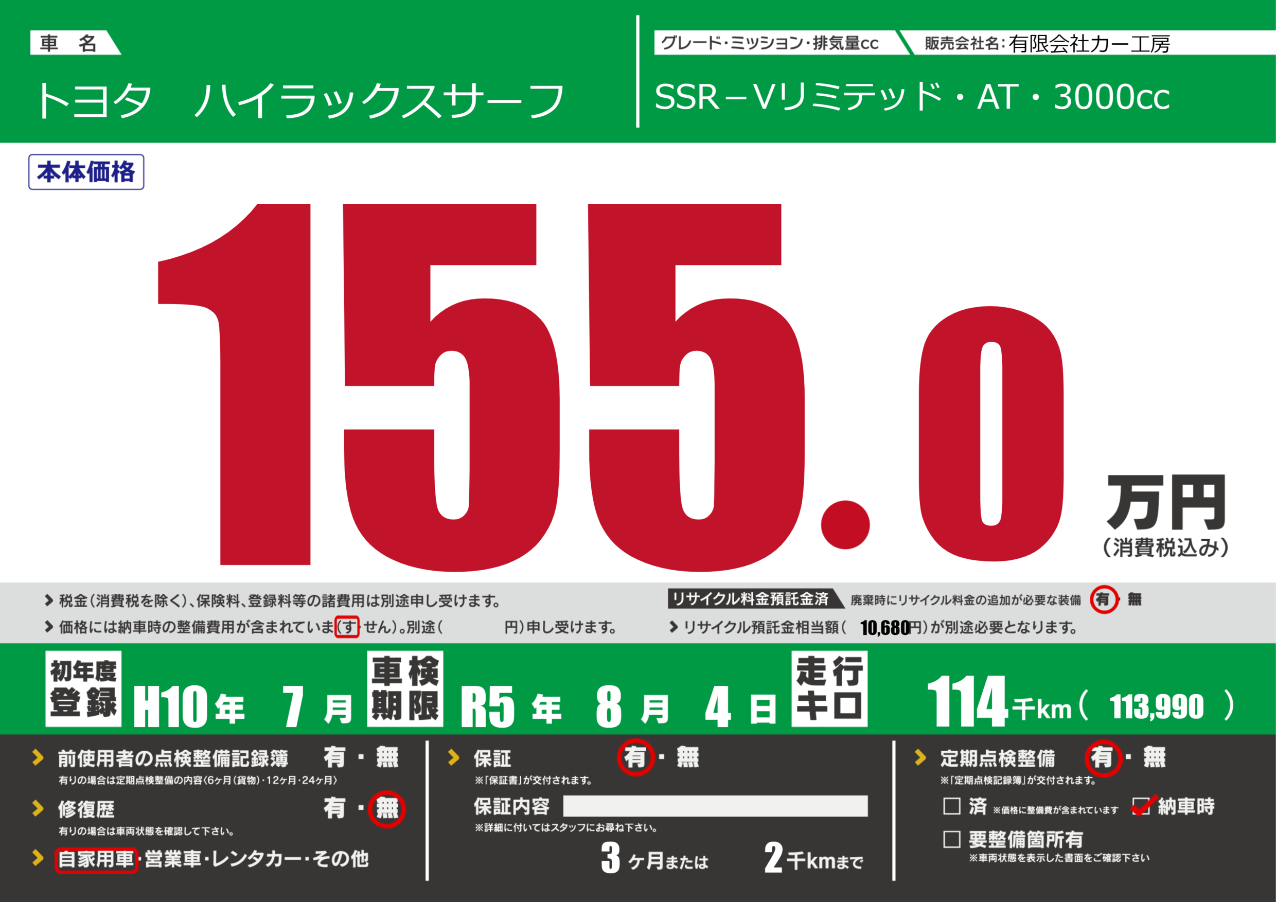 | 車名 | トヨタ ハイラックスサーフ | グレード ミッション 排気量 |
