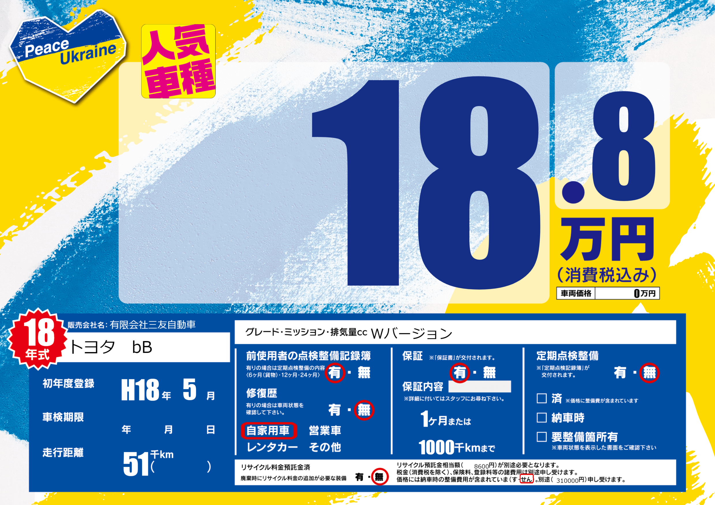 保証付き 保証内容(---) 1ヶ月または(1000)千kmまで |