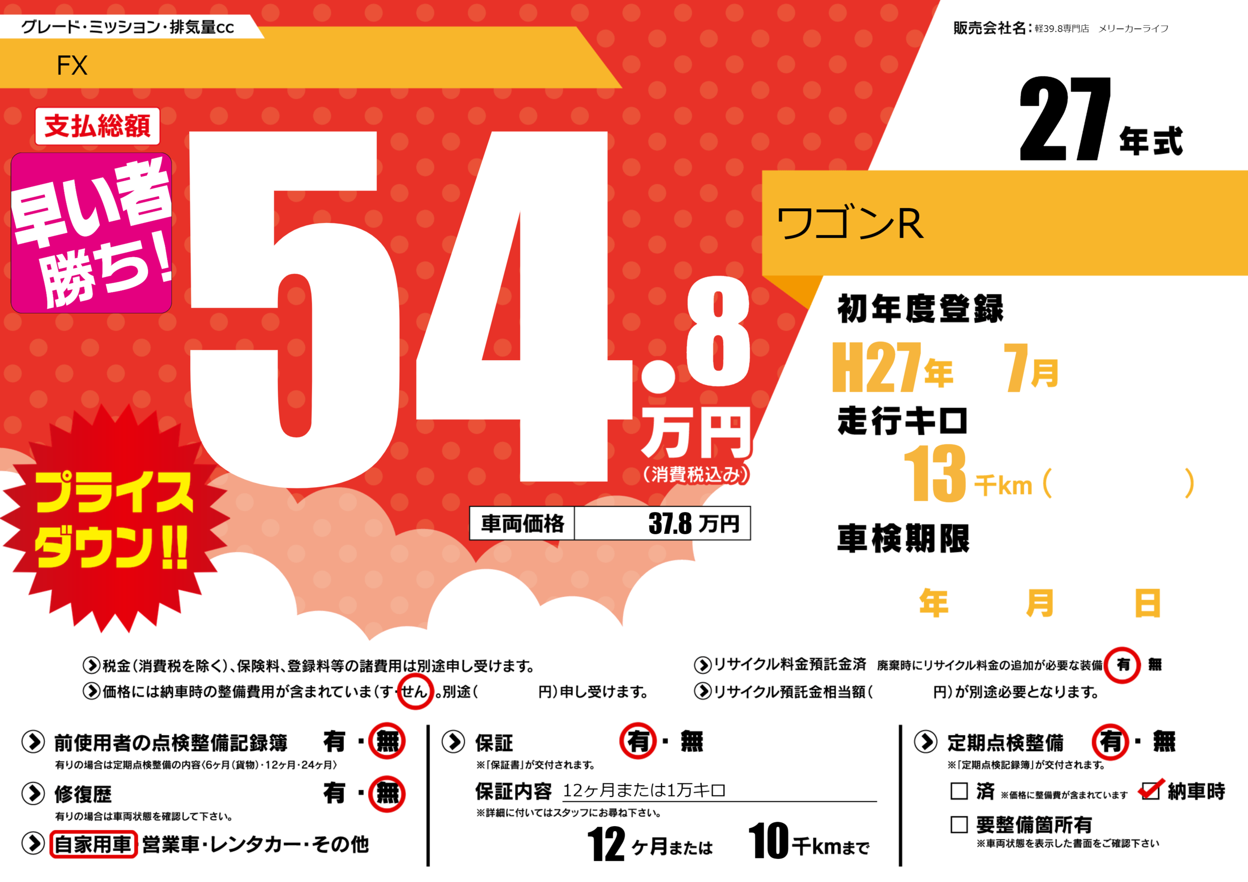 | 車名 | ワゴンR | グレード ミッション 排気量 |