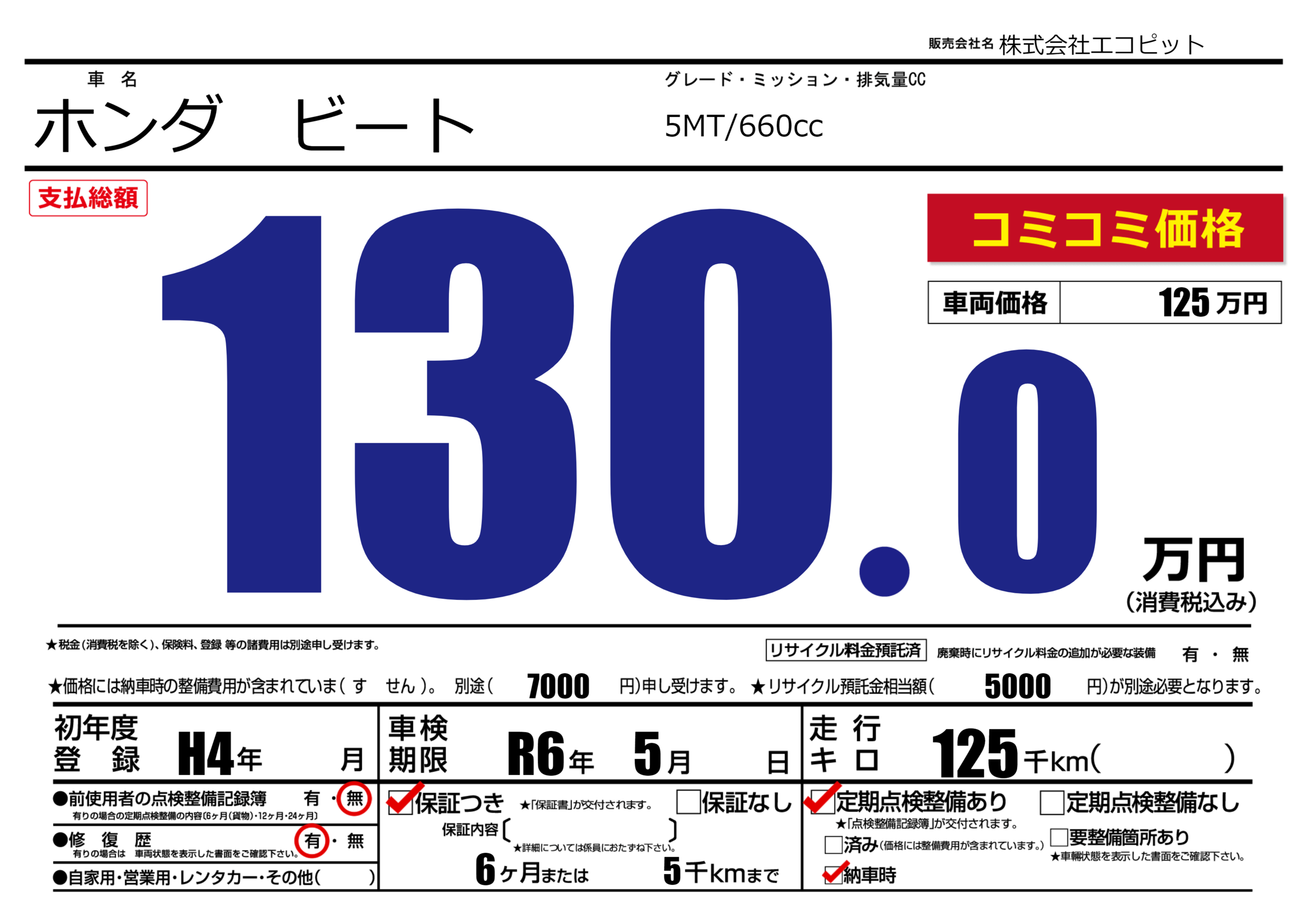 | 車名 | ホンダ ビート | グレード ミッション 排気量 |