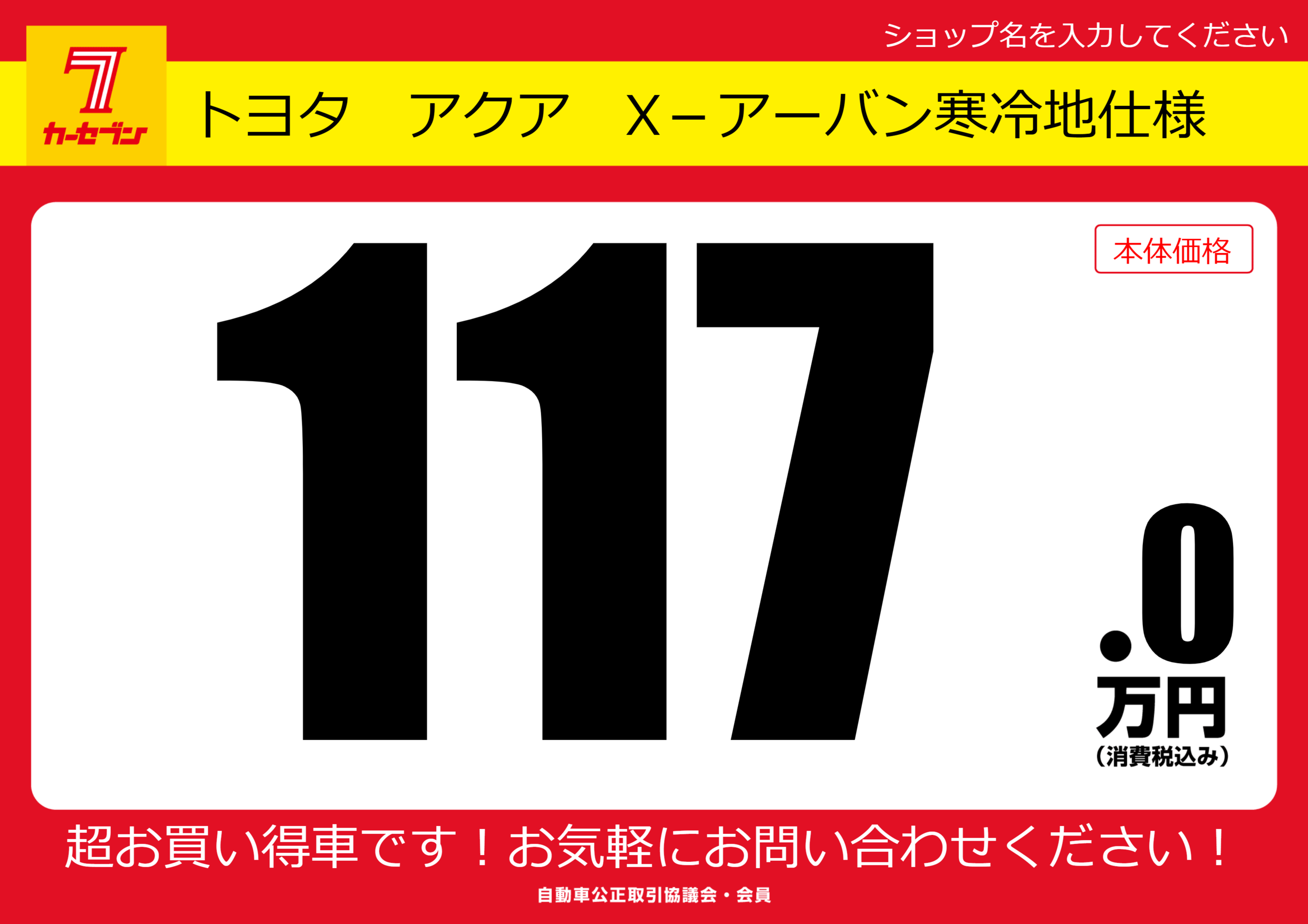 | 車名 | トヨタ アクア X-アーバン寒冷地仕様 | グレード ミッション 排気量 |