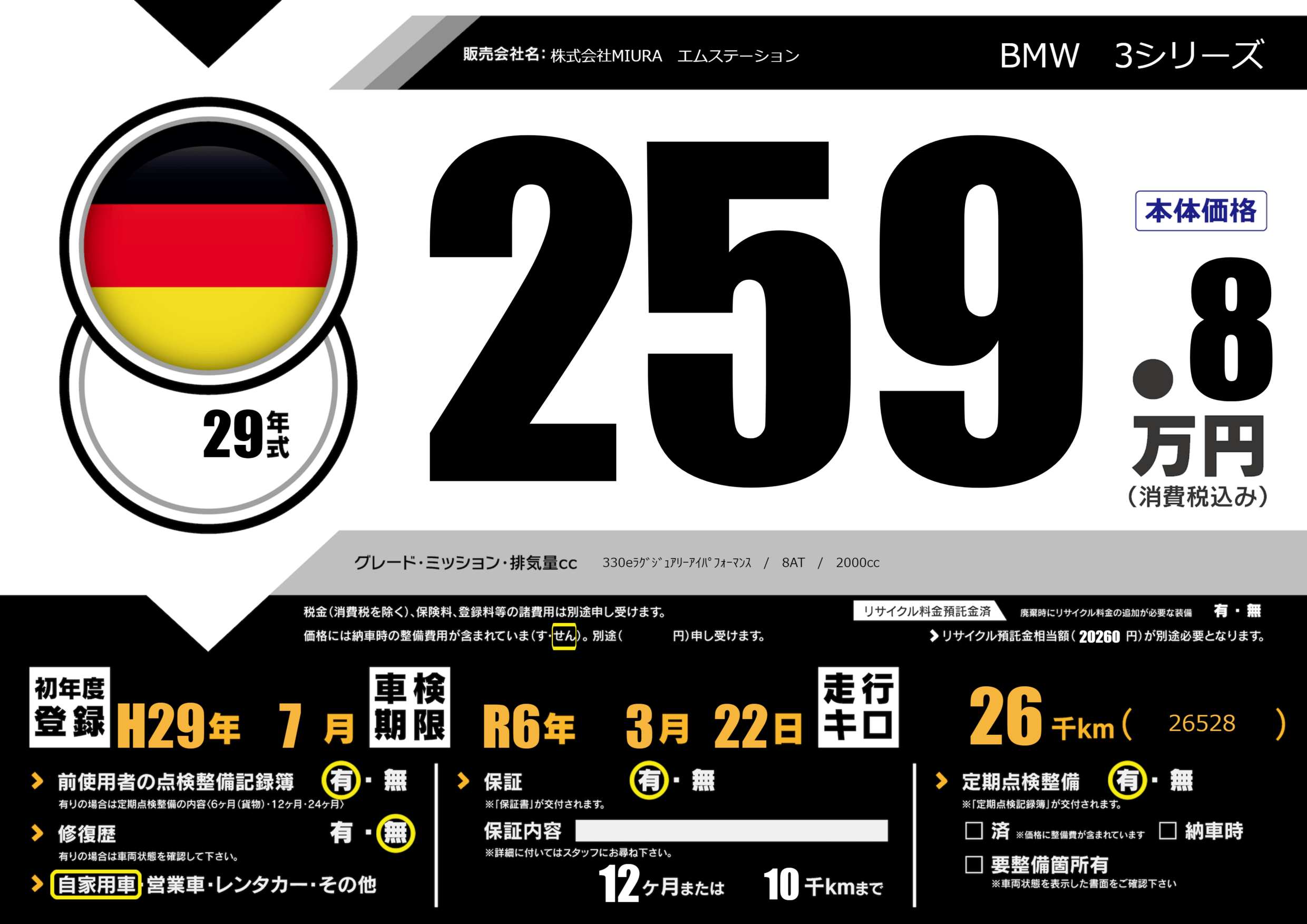 | 車名 | BMW 3シリーズ | グレード ミッション 排気量 |