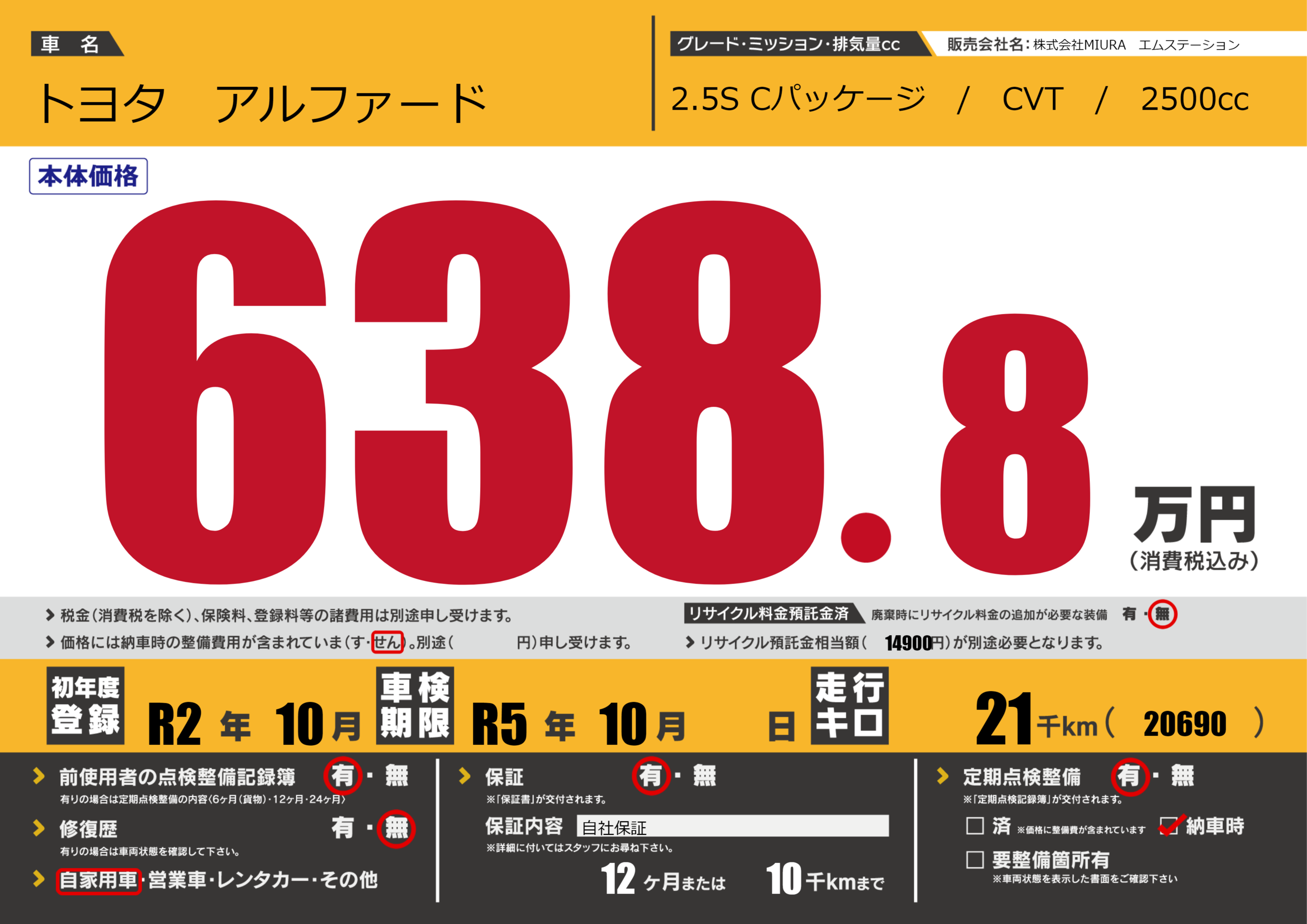 | 車名 | トヨタ アルファード | グレード ミッション 排気量 |
