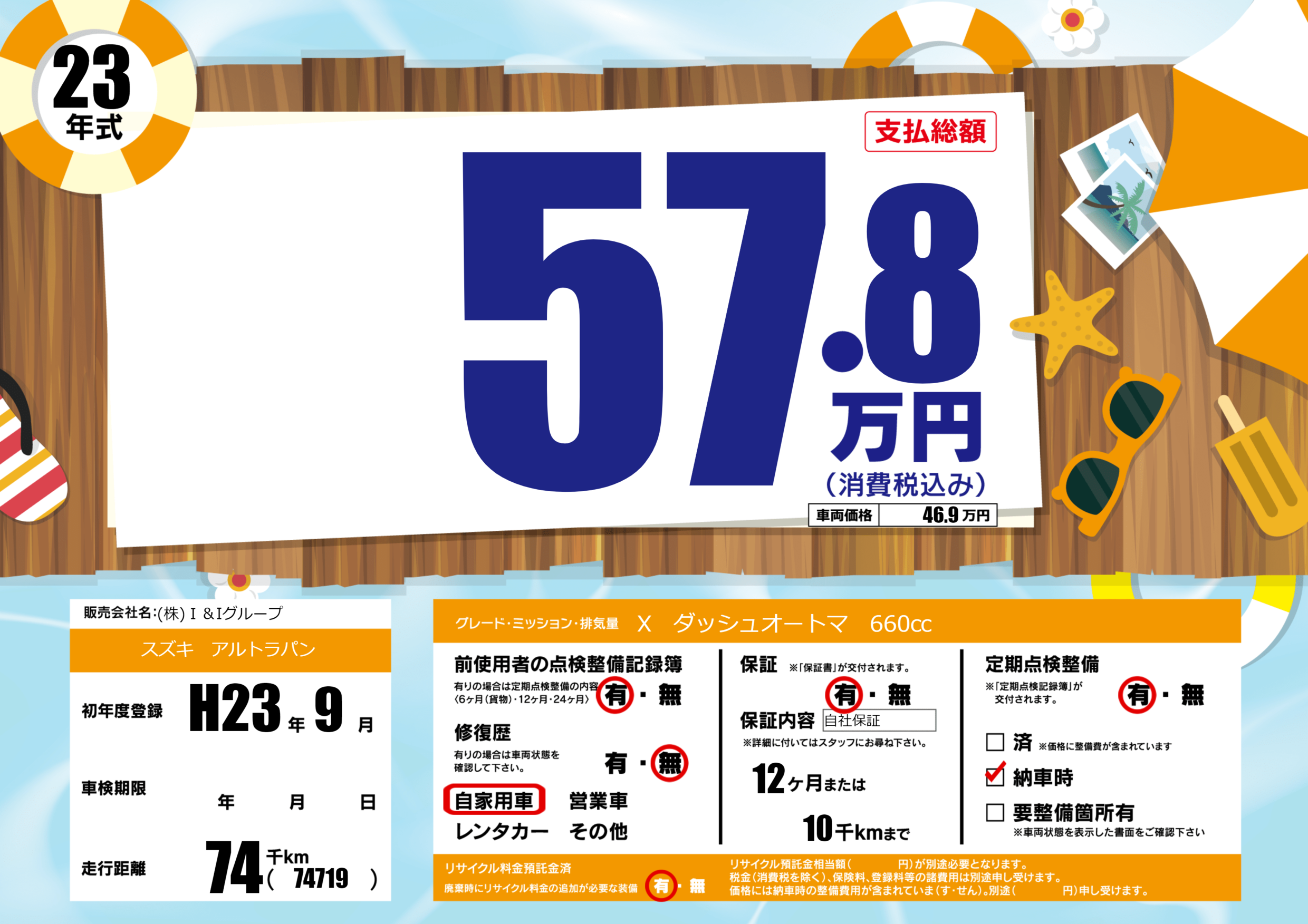 | 走行キロ | 7.4万km | 初年度登録 | H23年9月 |