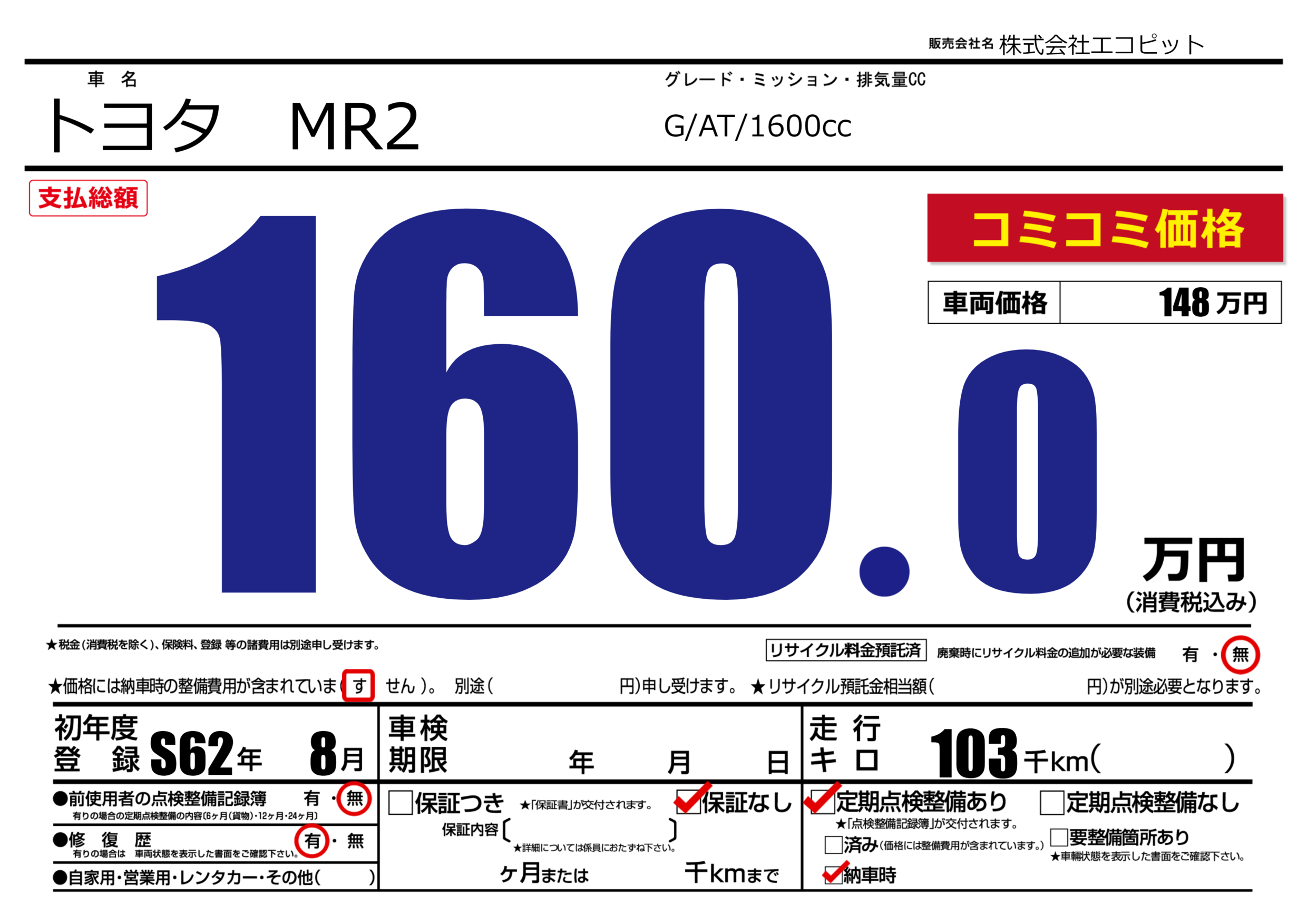| 車名 | トヨタ MR2 | グレード ミッション 排気量 |