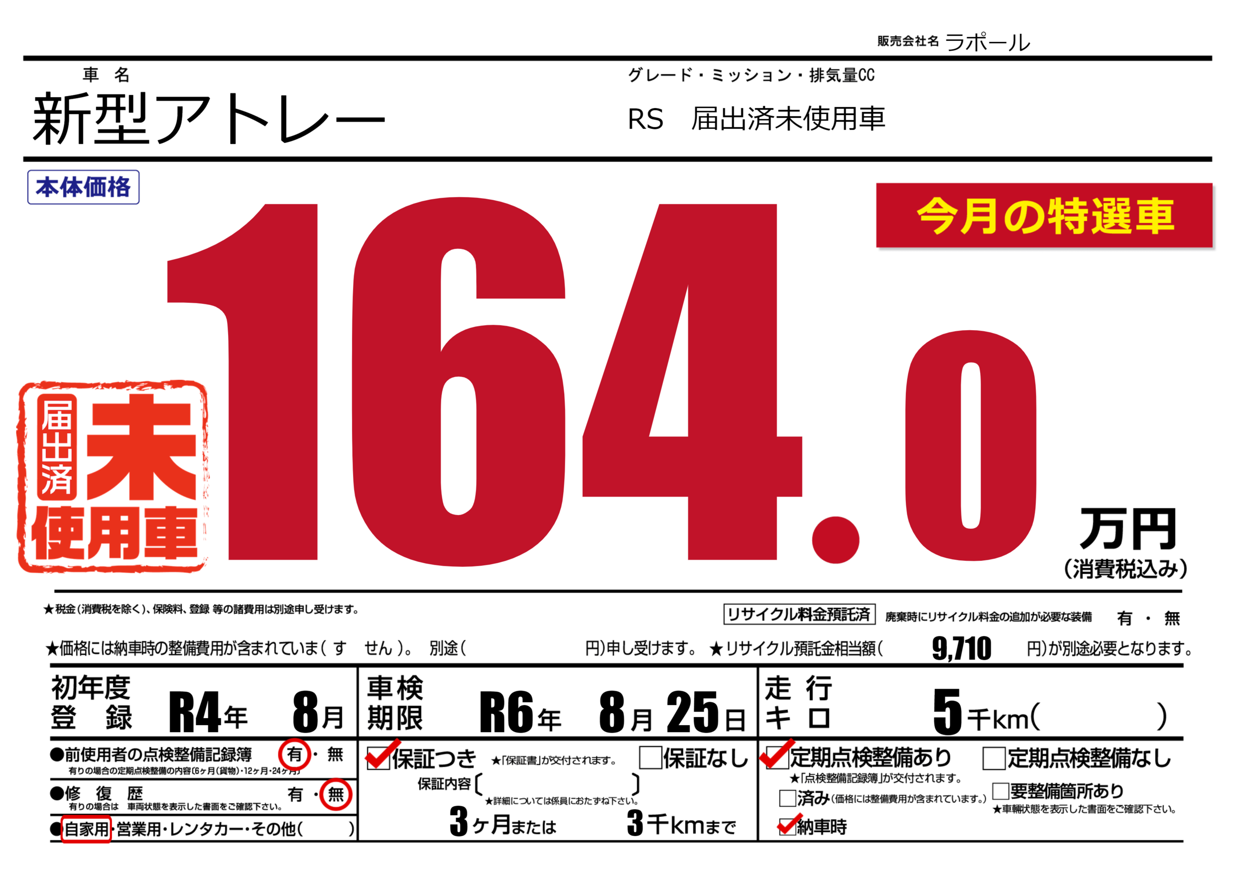 | 走行キロ | 0.5万km | 初年度登録 | R4年8月 |