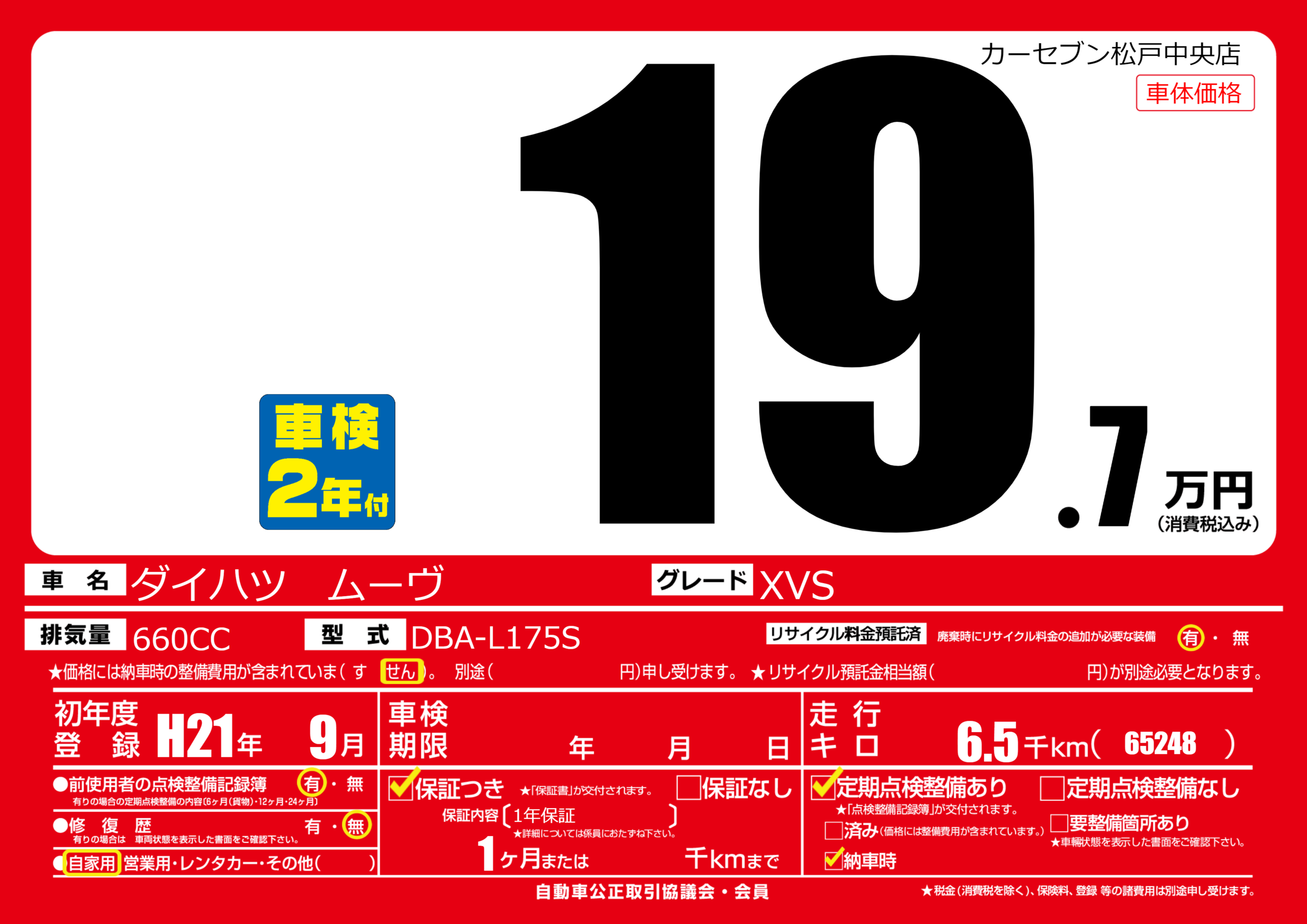 | 車名 | ダイハツ ムーヴ | グレード ミッション 排気量 |