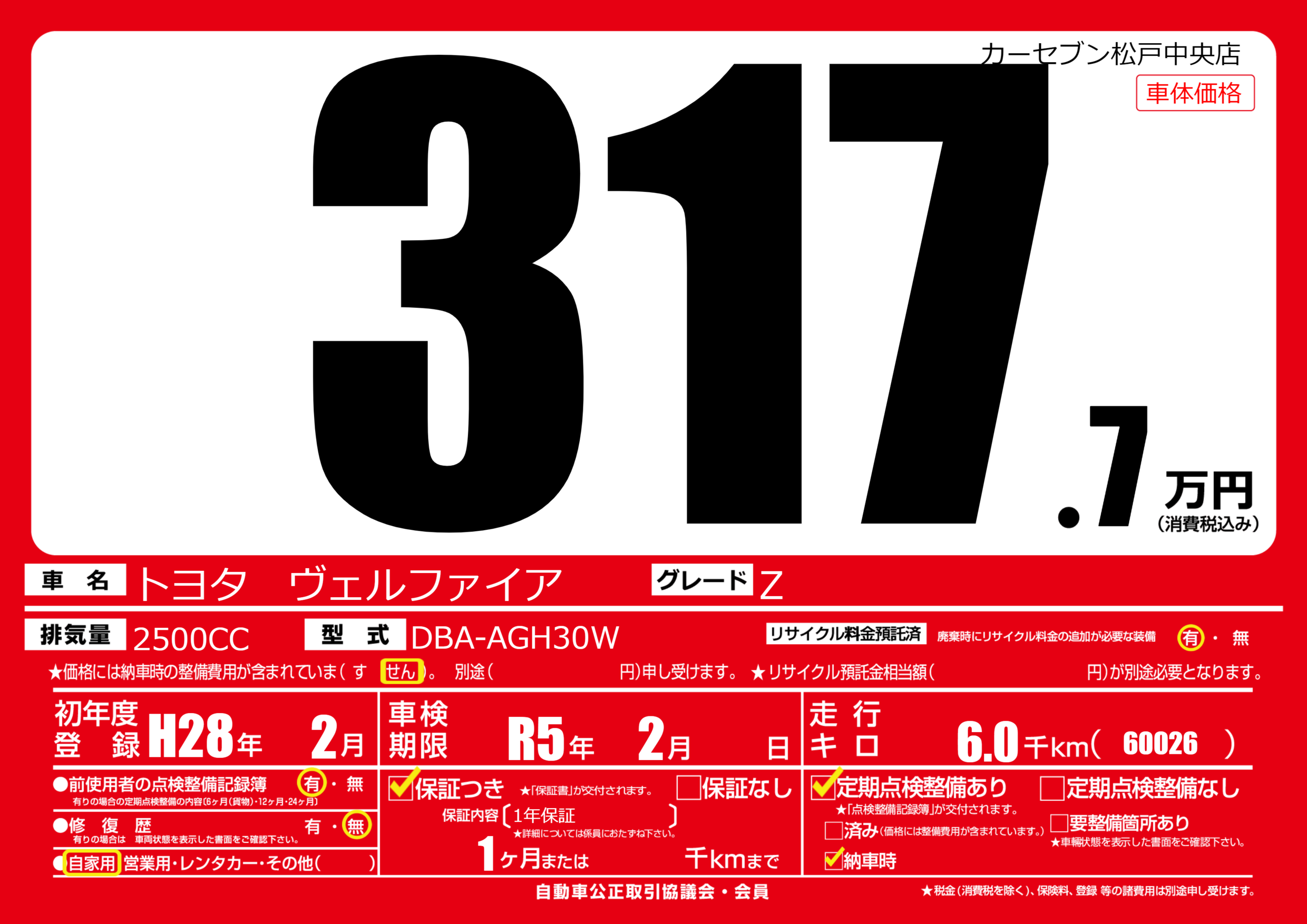 | 車名 | トヨタ ヴェルファイア | グレード ミッション 排気量 |