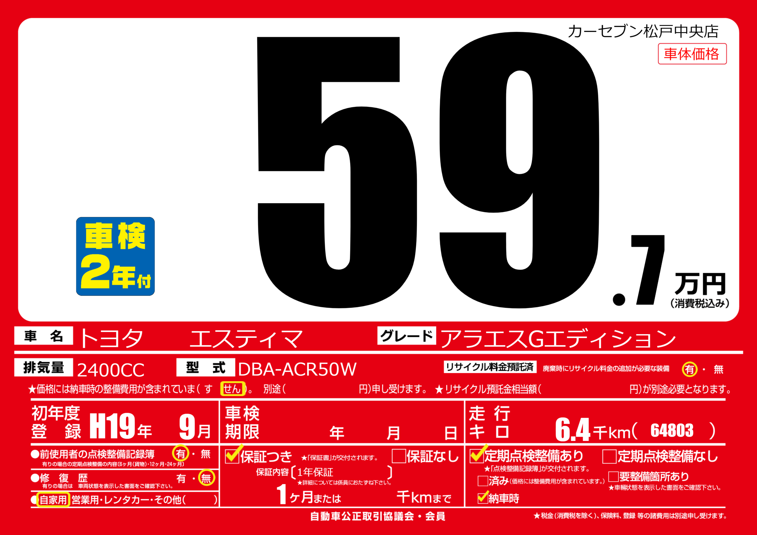 | 車名 | トヨタ エスティマ | グレード ミッション 排気量 |