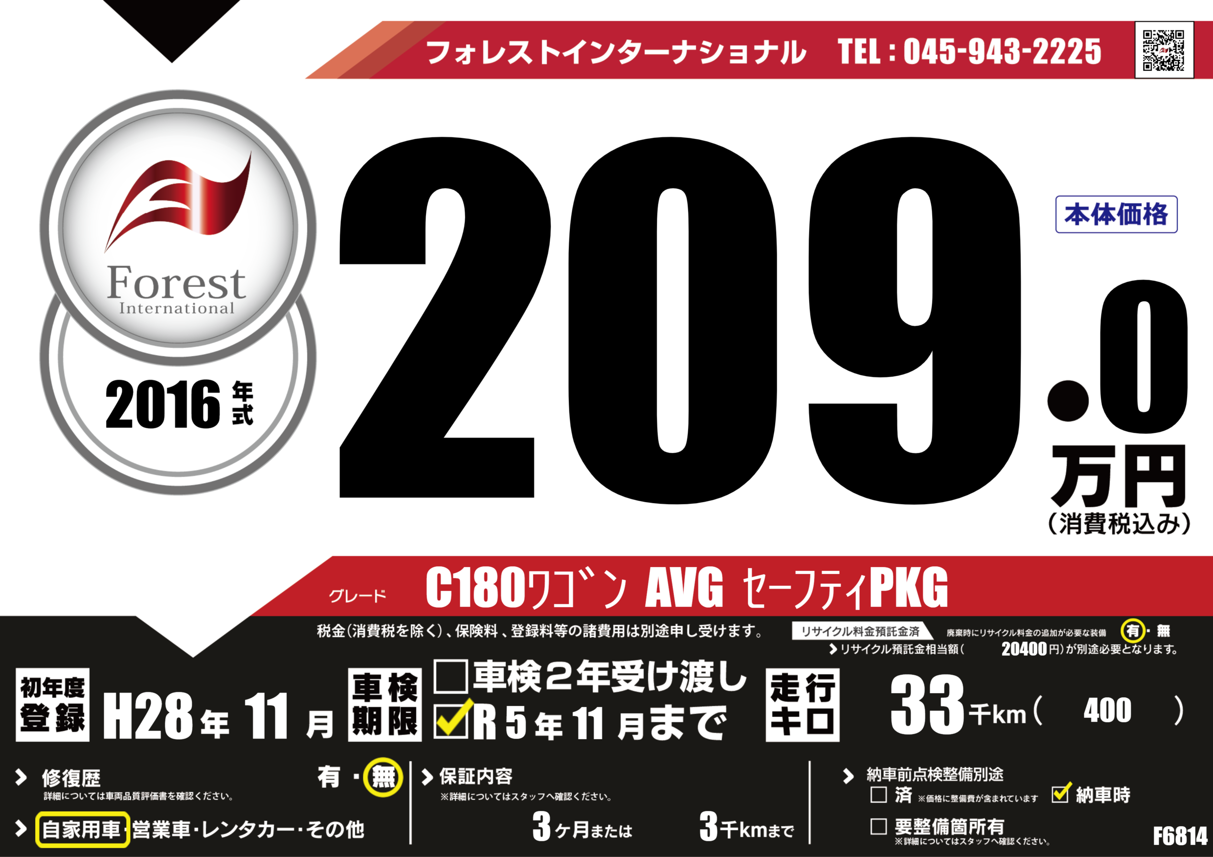 | 走行キロ | 3.3万km | 初年度登録 | H28年11月 |