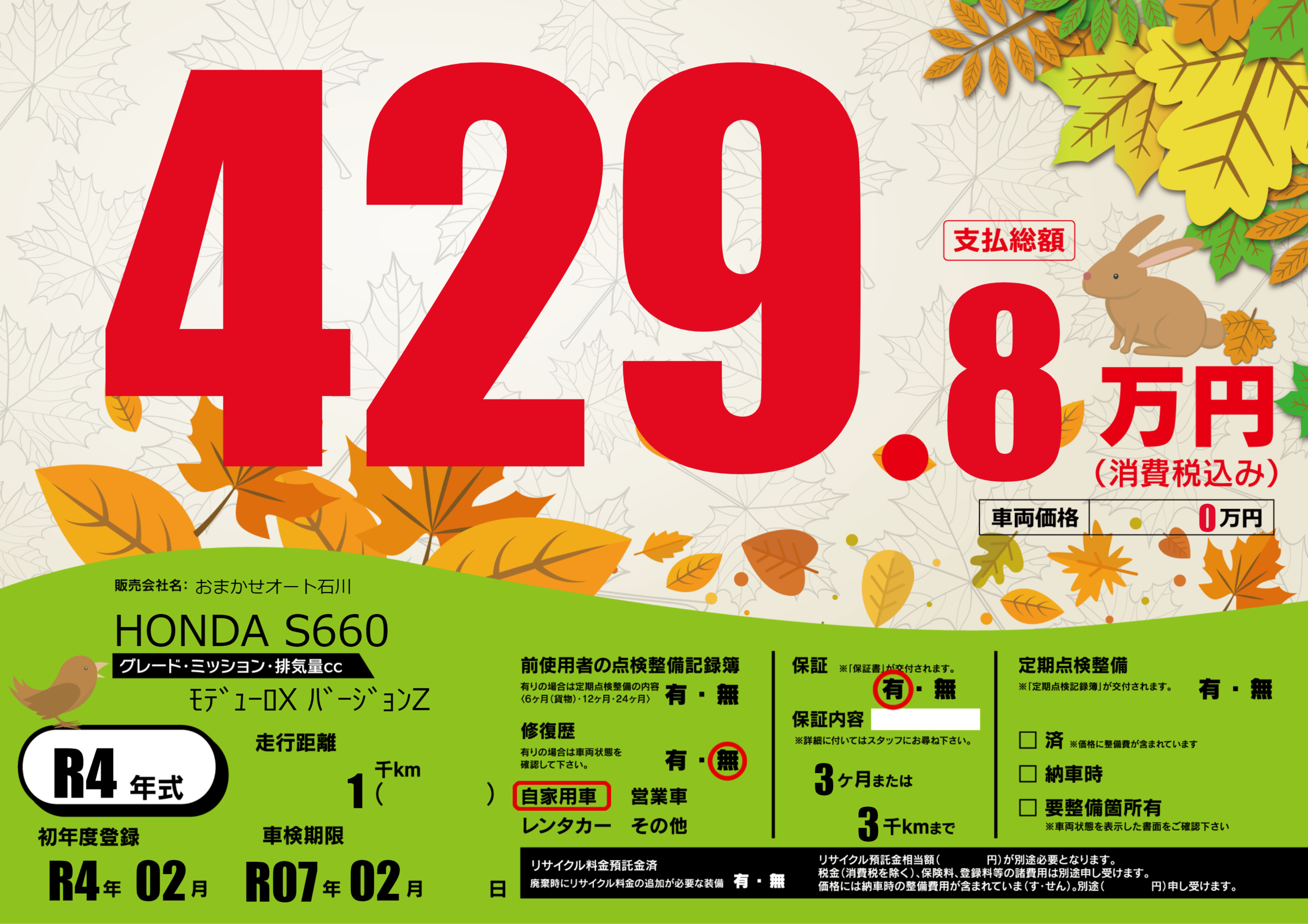 | 車名 | HONDA S660 | グレード ミッション 排気量 |