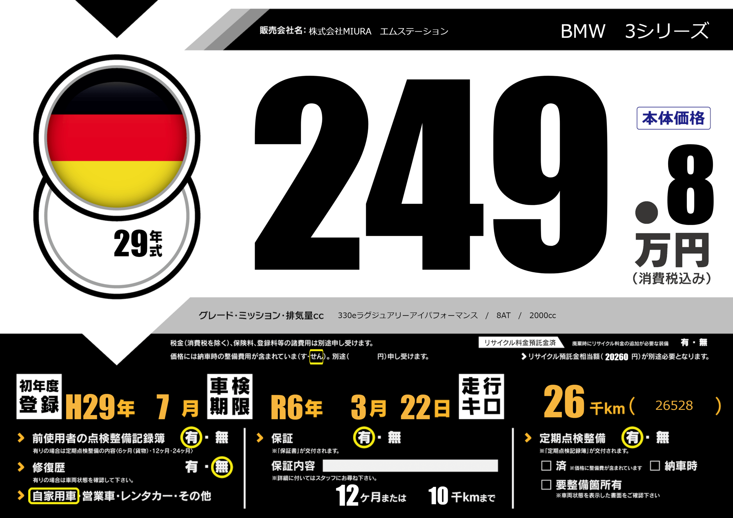 | 車名 | BMW 3シリーズ | グレード ミッション 排気量 |