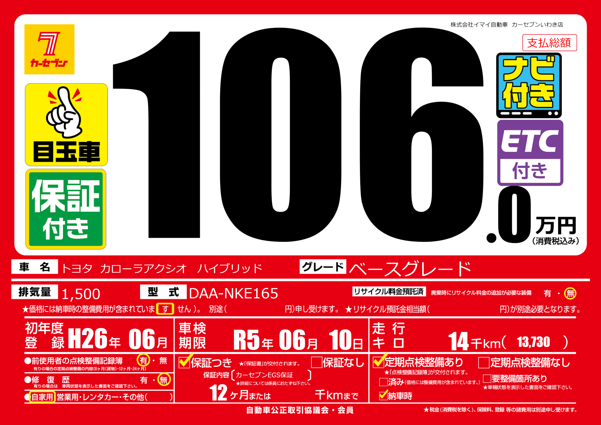 | 走行キロ | 1.4万km | 初年度登録 | H26年06月 |