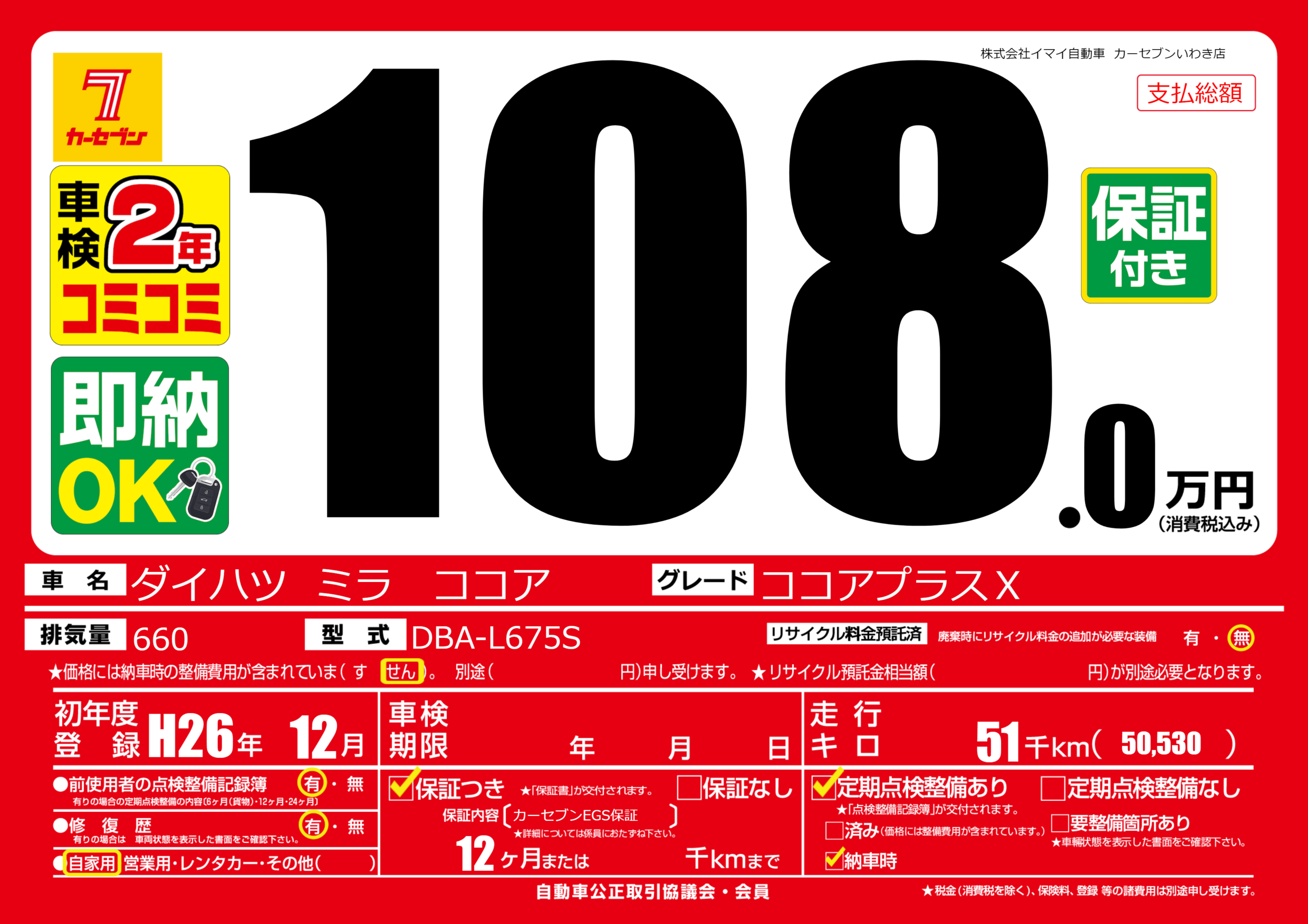 | 車名 | ダイハツ ミラ ココア | グレード ミッション 排気量 |