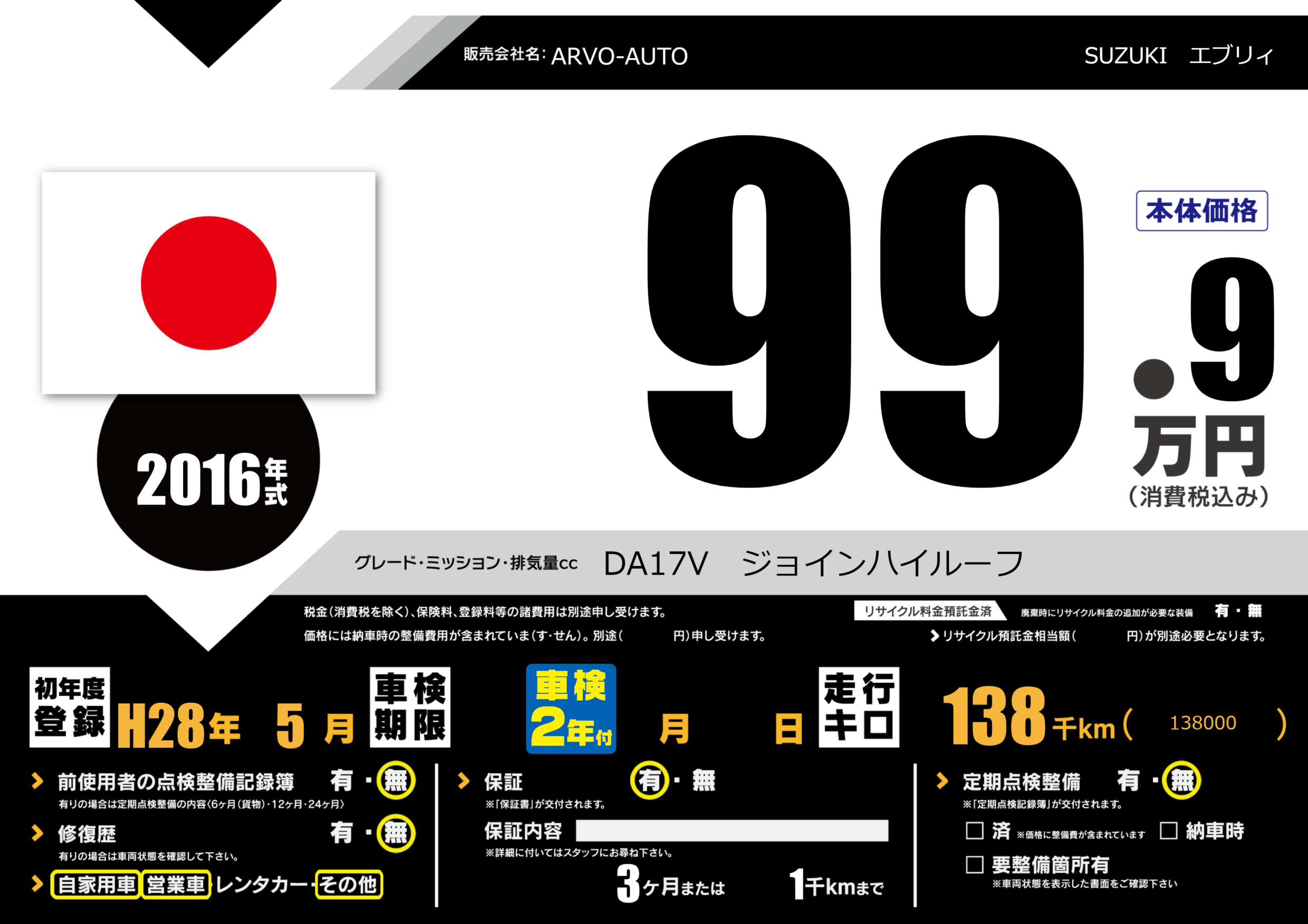 | 車名 | SUZUKI エブリィ | グレード ミッション 排気量 |