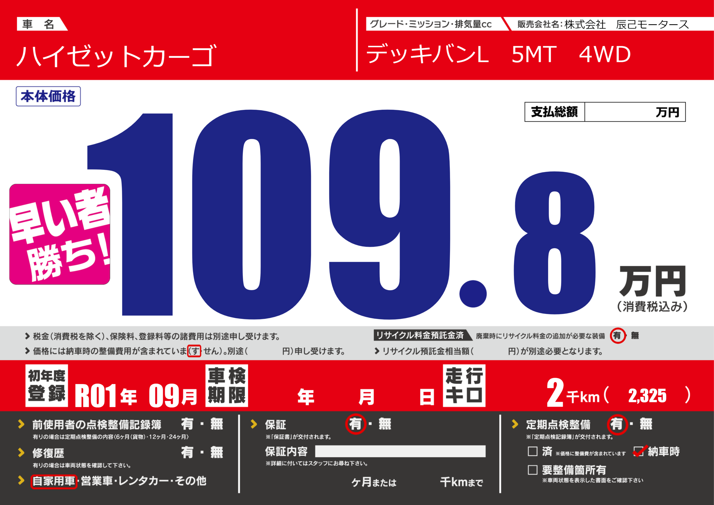 | 定期点検整備 | 定期点検整備あり 納車時あり | ||