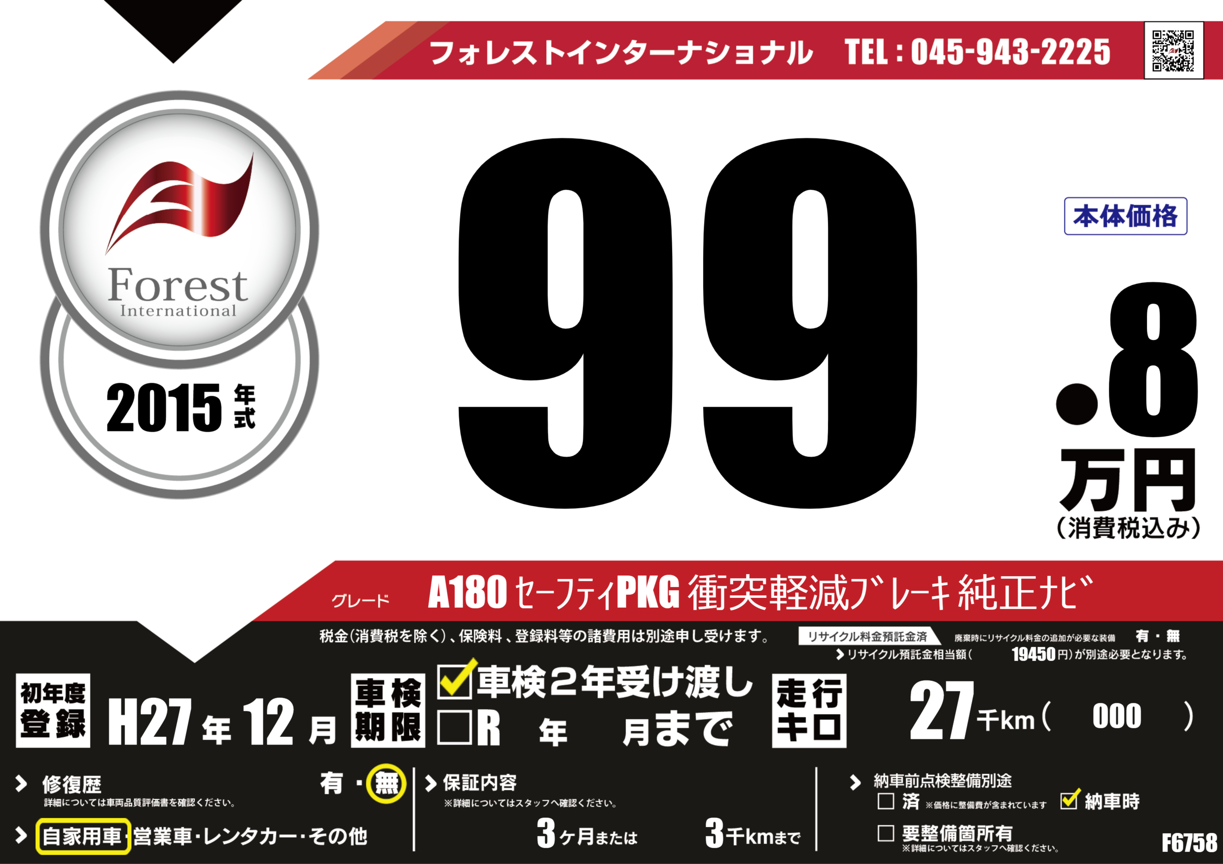 | 走行キロ | 2.7万km | 初年度登録 | H27年12月 |
