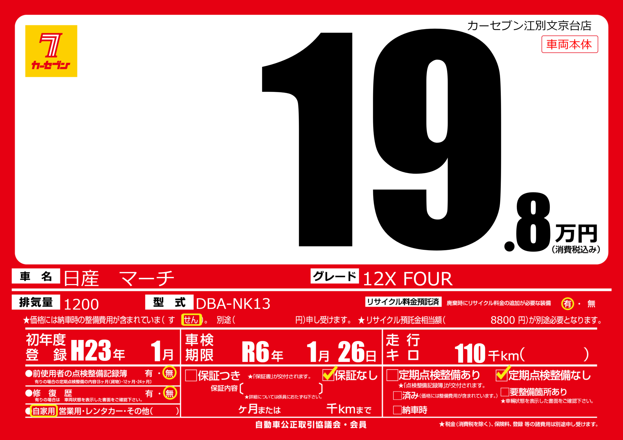 | 車名 | 日産 マーチ | グレード ミッション 排気量 |