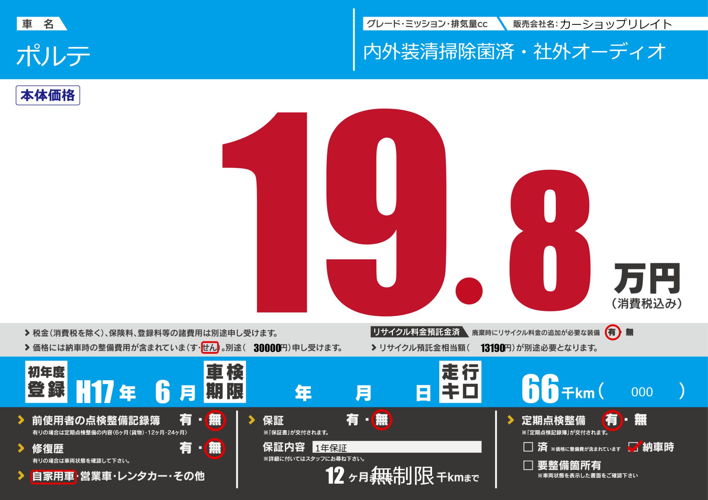 | 走行キロ | 6.6万km | 初年度登録 | H17年6月 |
