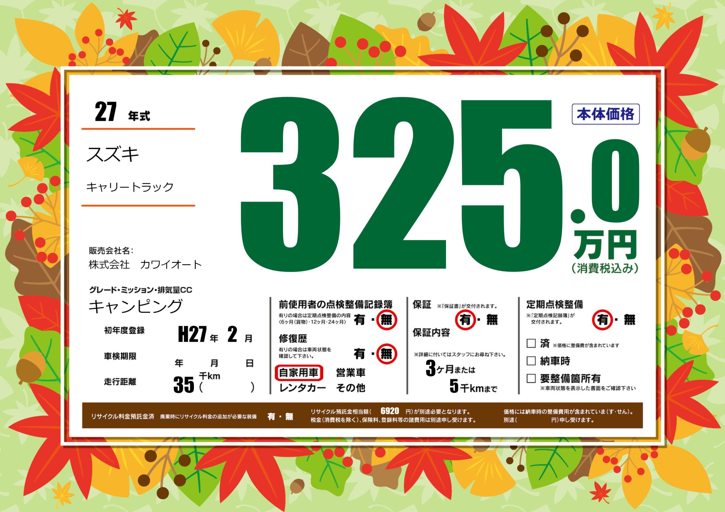 | 走行キロ | 3.5万km | 初年度登録 | H27年2月 |