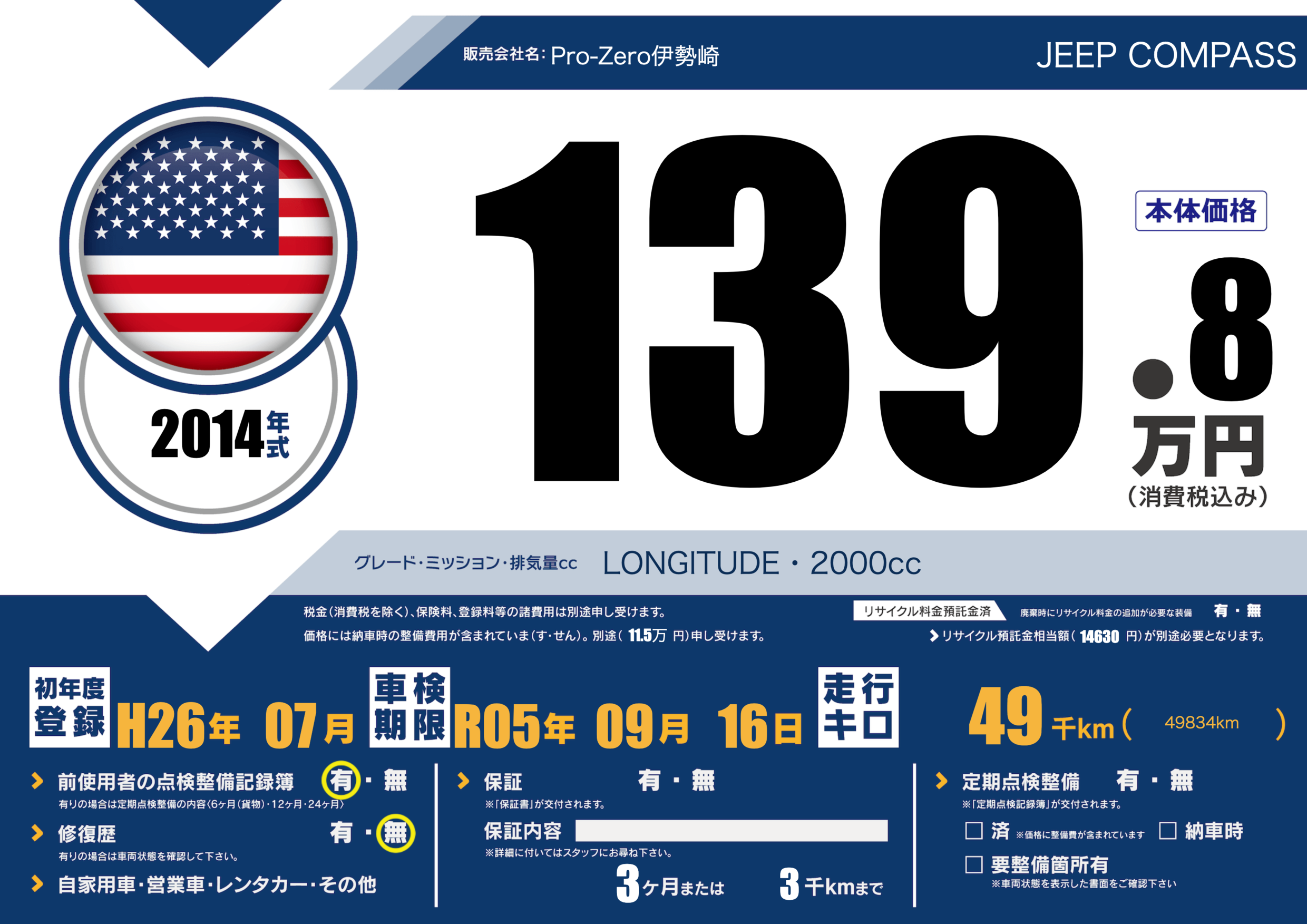| 車名 | JEEP COMPASS | グレード ミッション 排気量 |