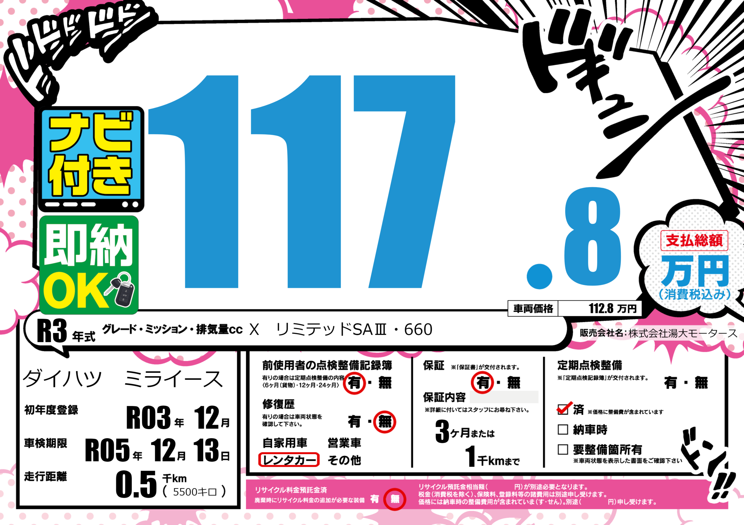 | 走行キロ | - | 初年度登録 | R03年12月 |
