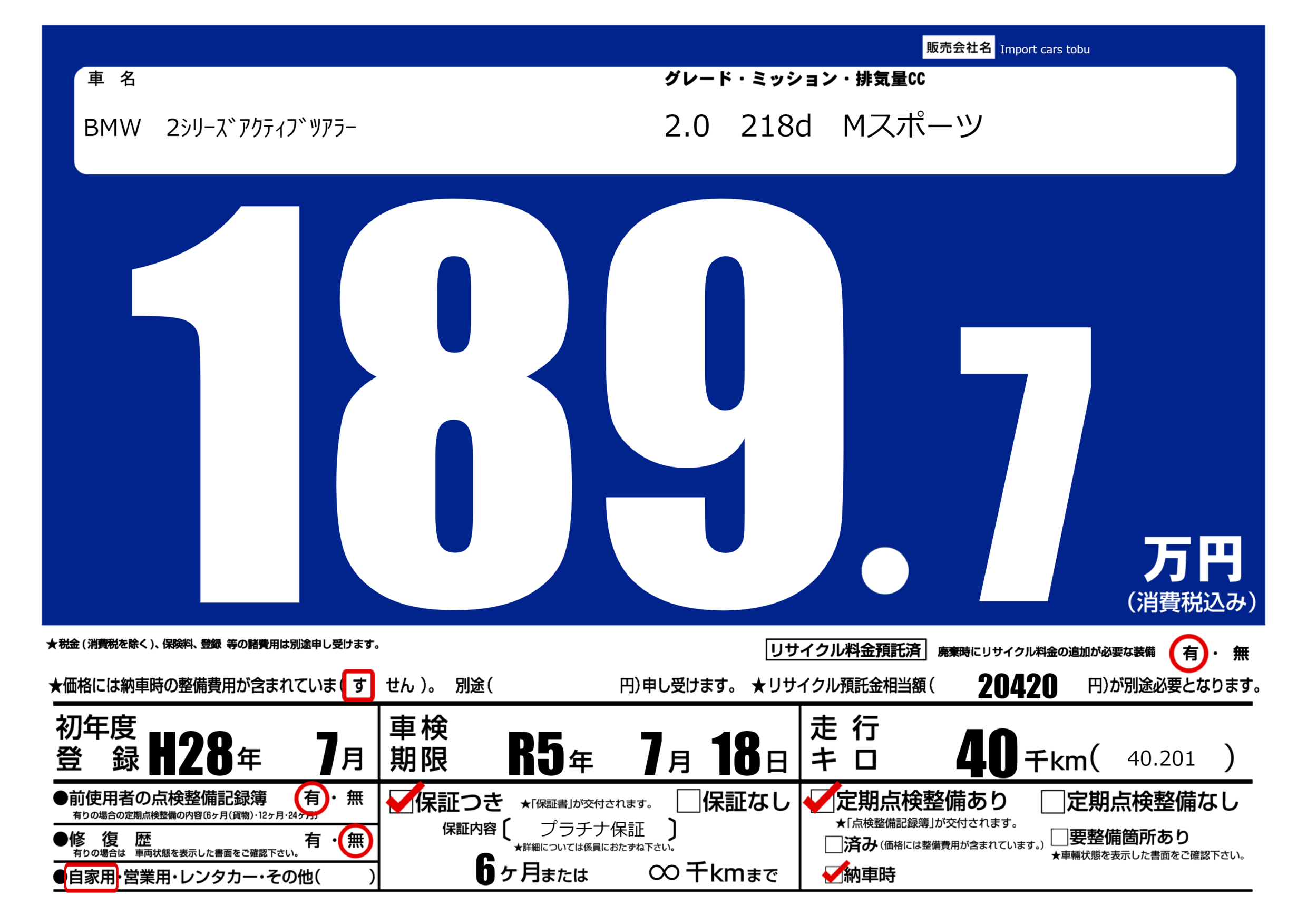 保証内容(   プラチナ保証) 6ヶ月または∞千km