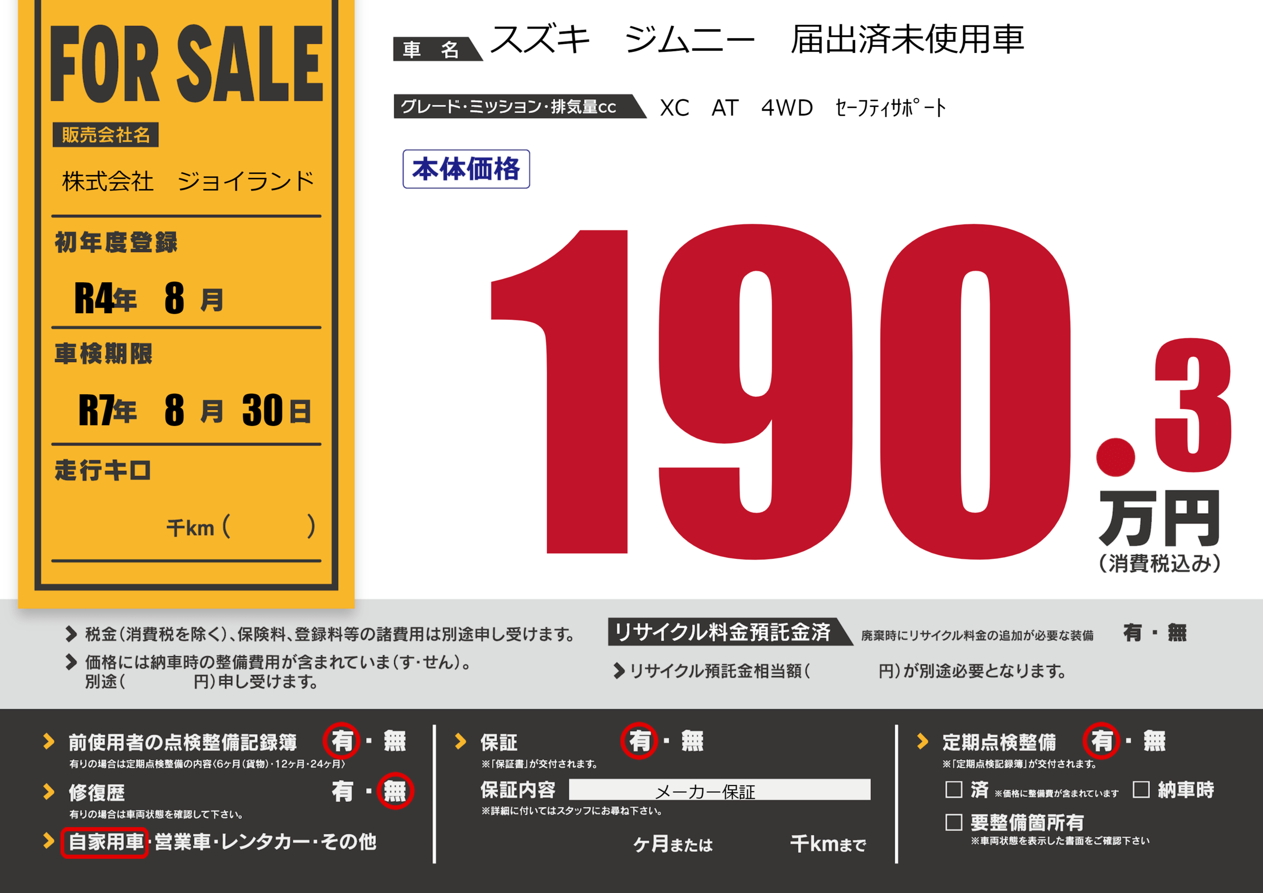 | 車名 | スズキ ジムニー 届出済未使用車 | グレード ミッション 排気量 |
