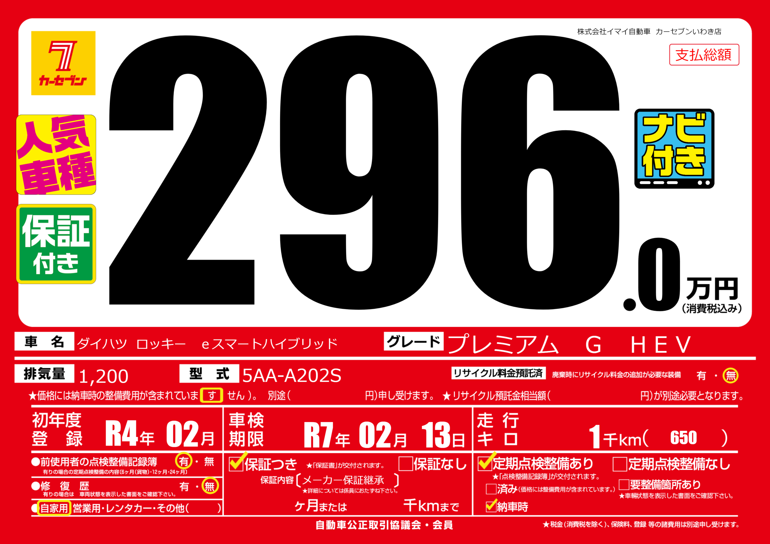 | 車検制限 | R7年 02月 13日 | ||