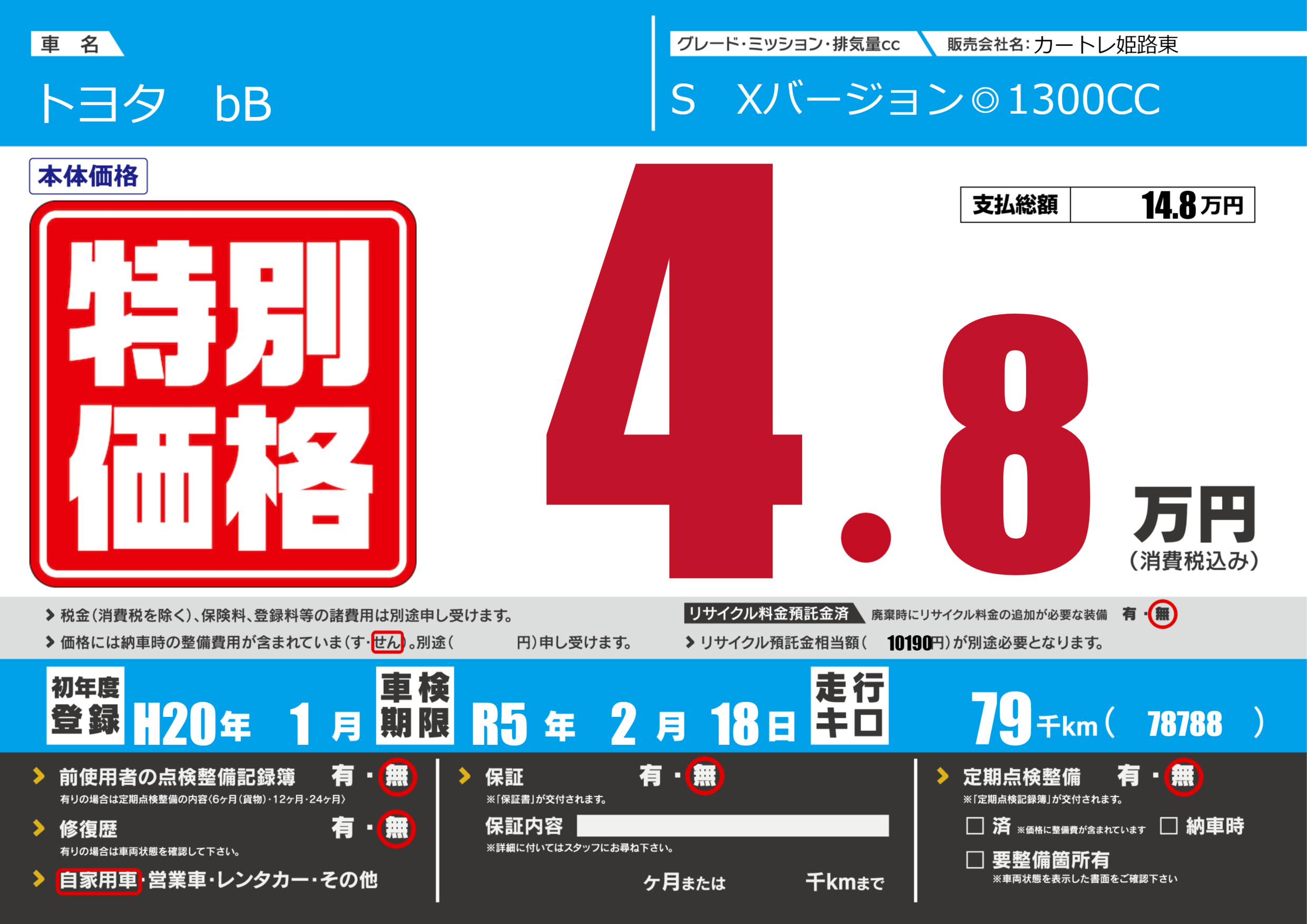 | 車名 | トヨタ bB | グレード ミッション 排気量 |