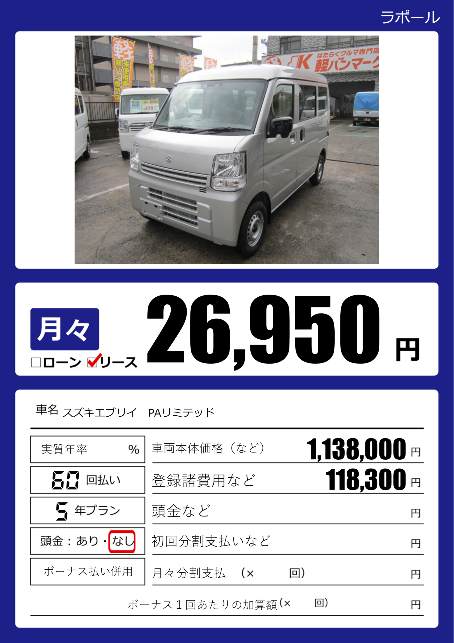 | 車名 | スズキエブリイ PAリミテッド | グレード ミッション 排気量 |
