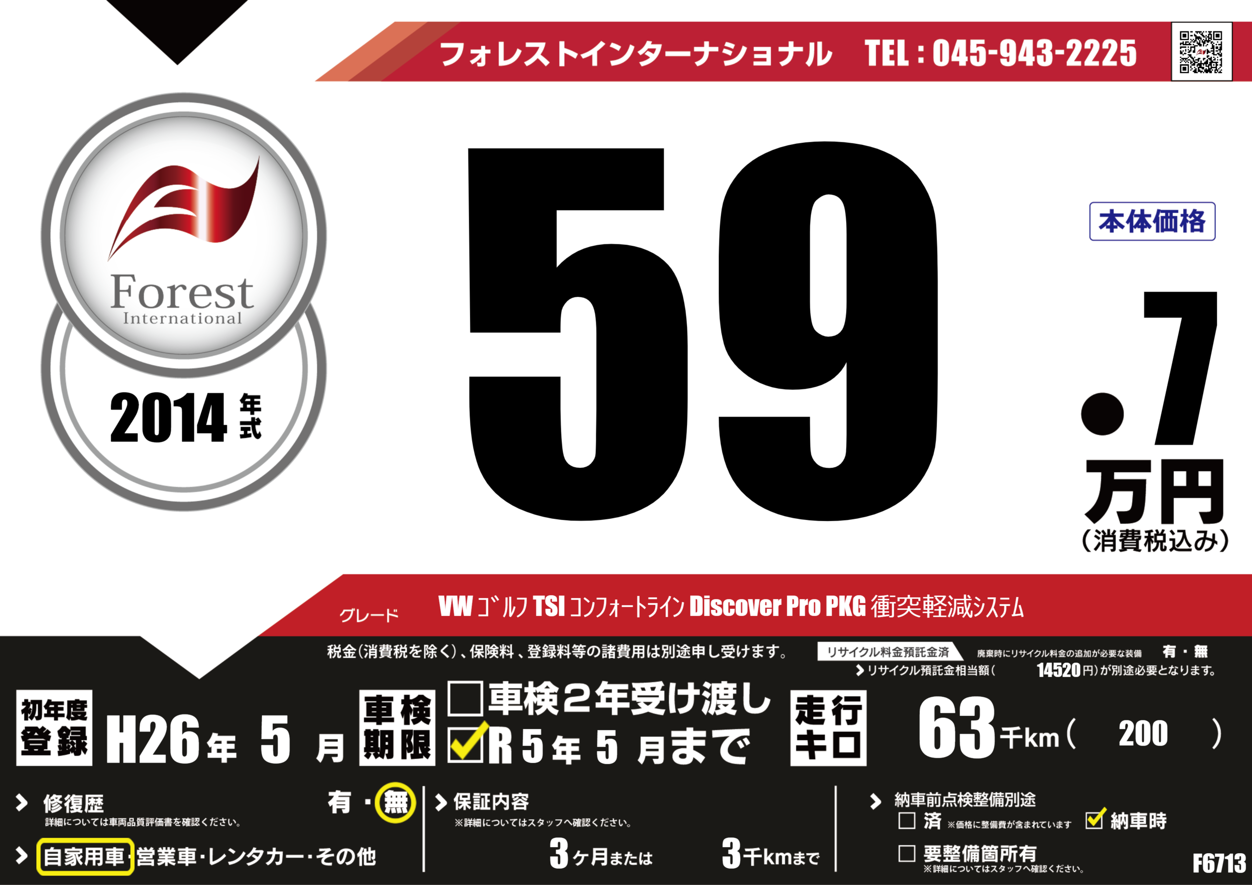 | 走行キロ | 6.3万km | 初年度登録 | H26年5月 |