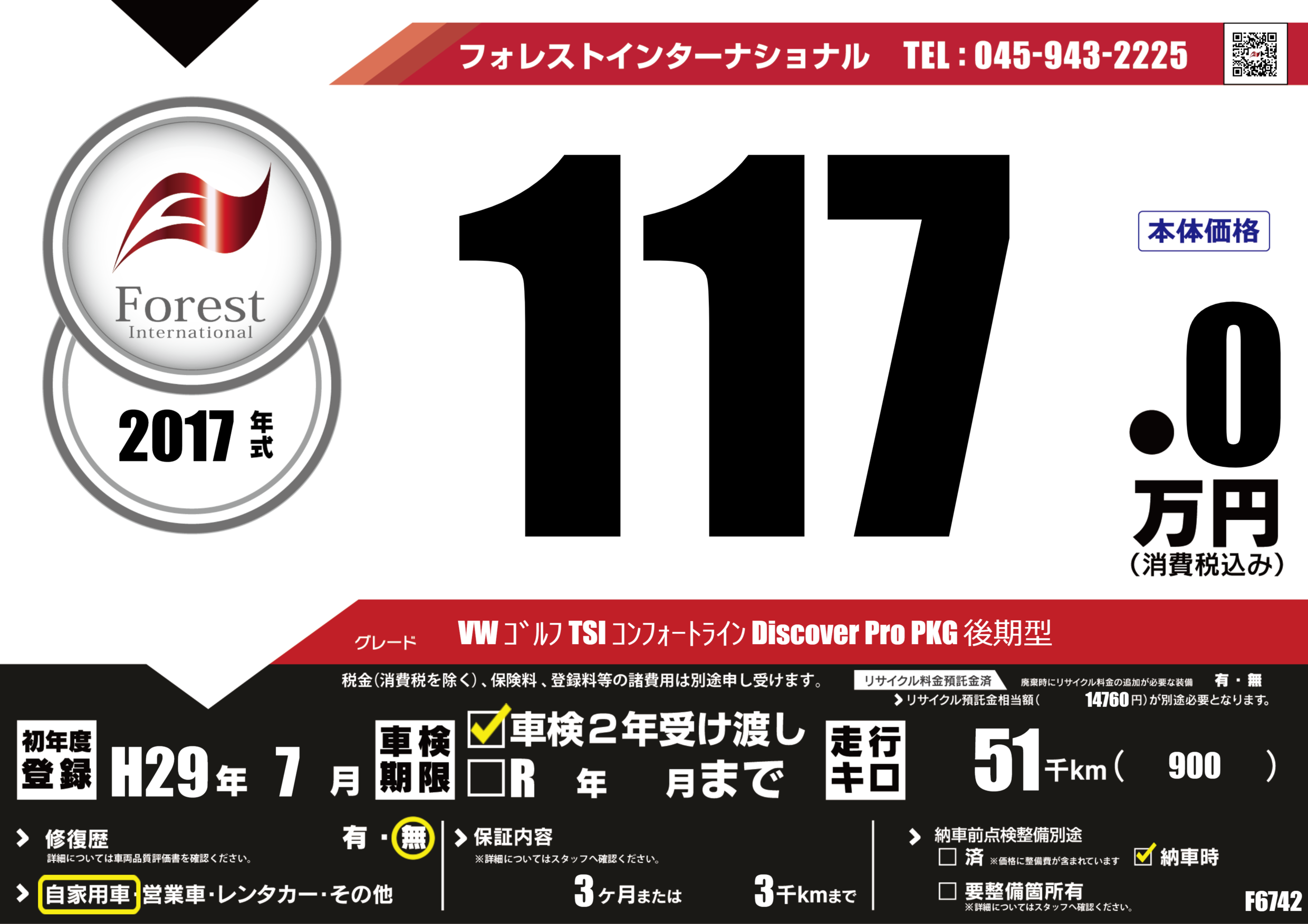 | 走行キロ | 5.1万km | 初年度登録 | H29年7月 |