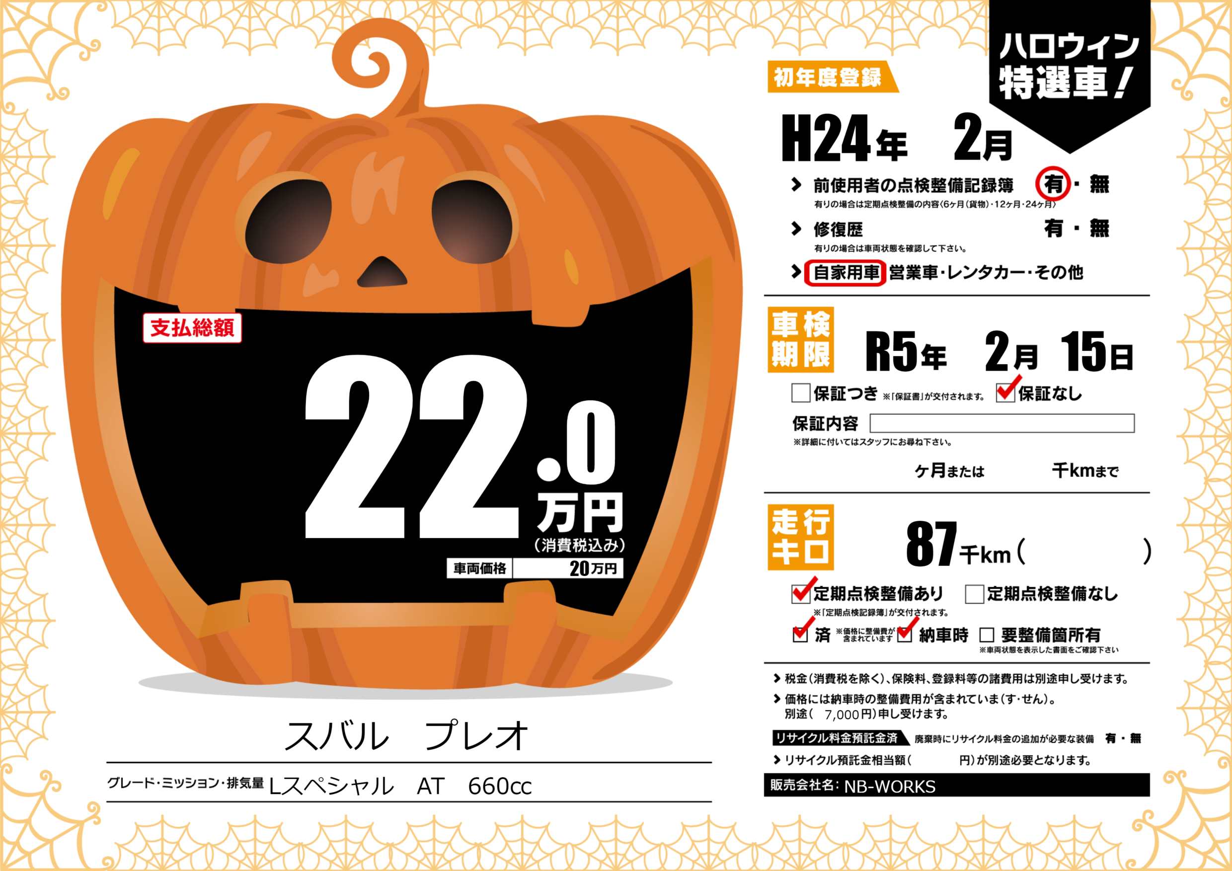 | 定期点検整備 | 定期点検整備あり 定期点検整備済み 納車時あり | ||
