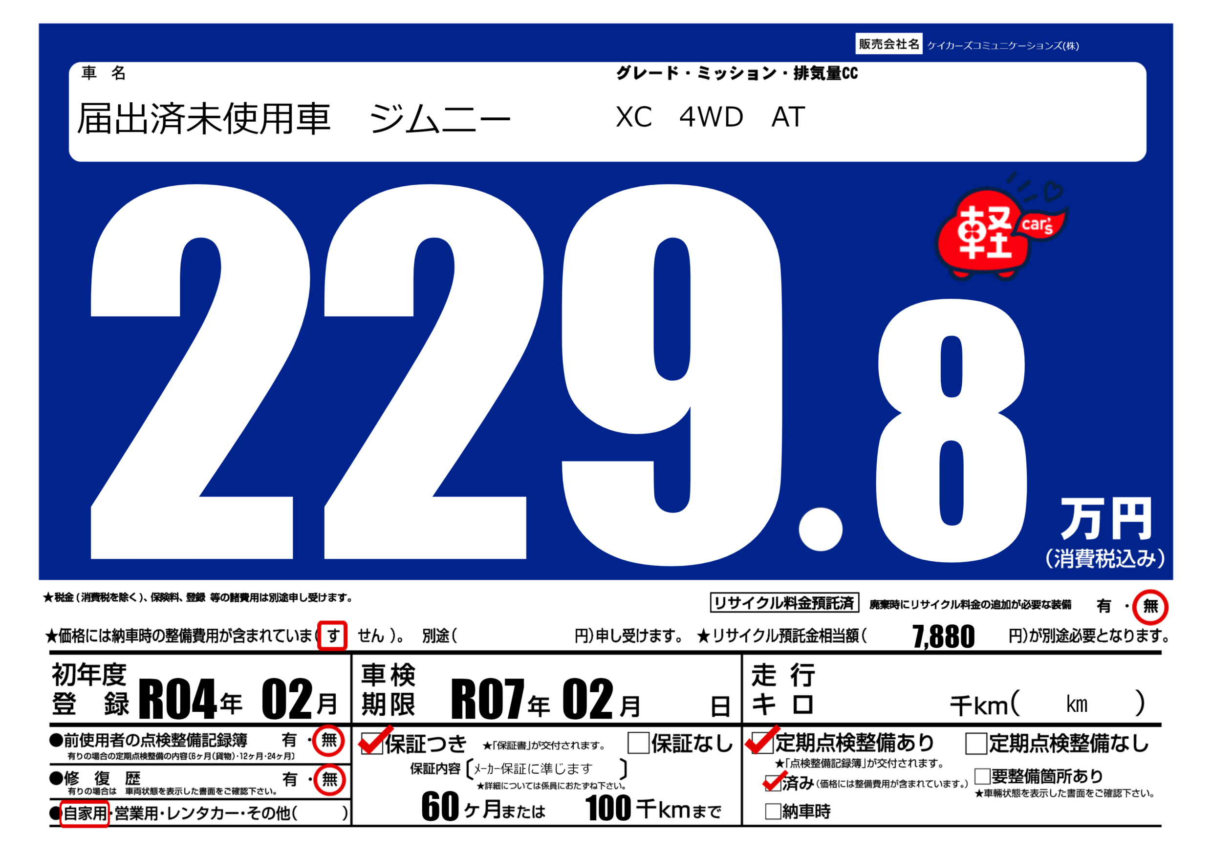 | 車名 | 届出済未使用車 ジムニー | グレード ミッション 排気量 |