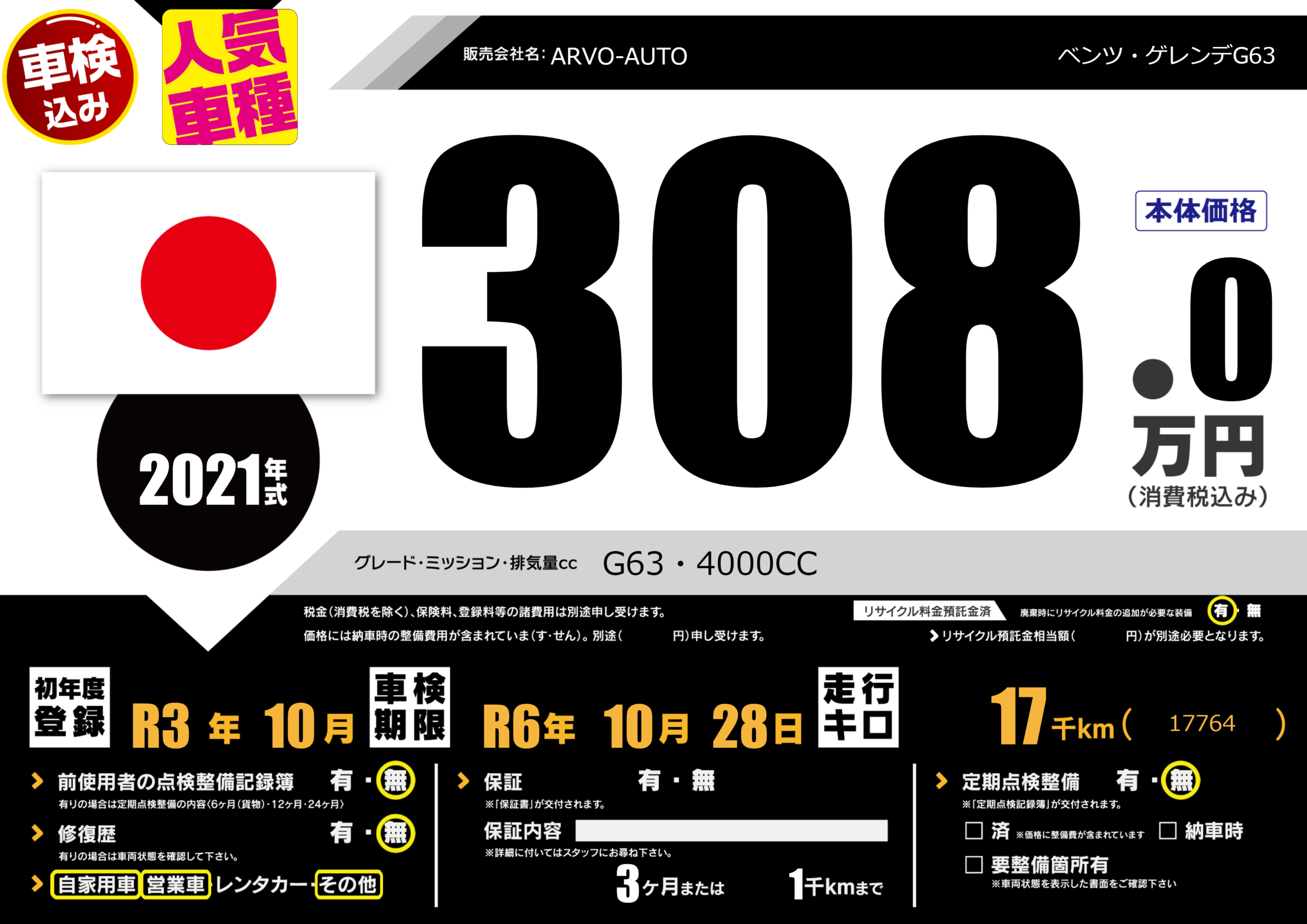 | 車名 | ベンツ・ゲレンデG63 | グレード ミッション 排気量 |