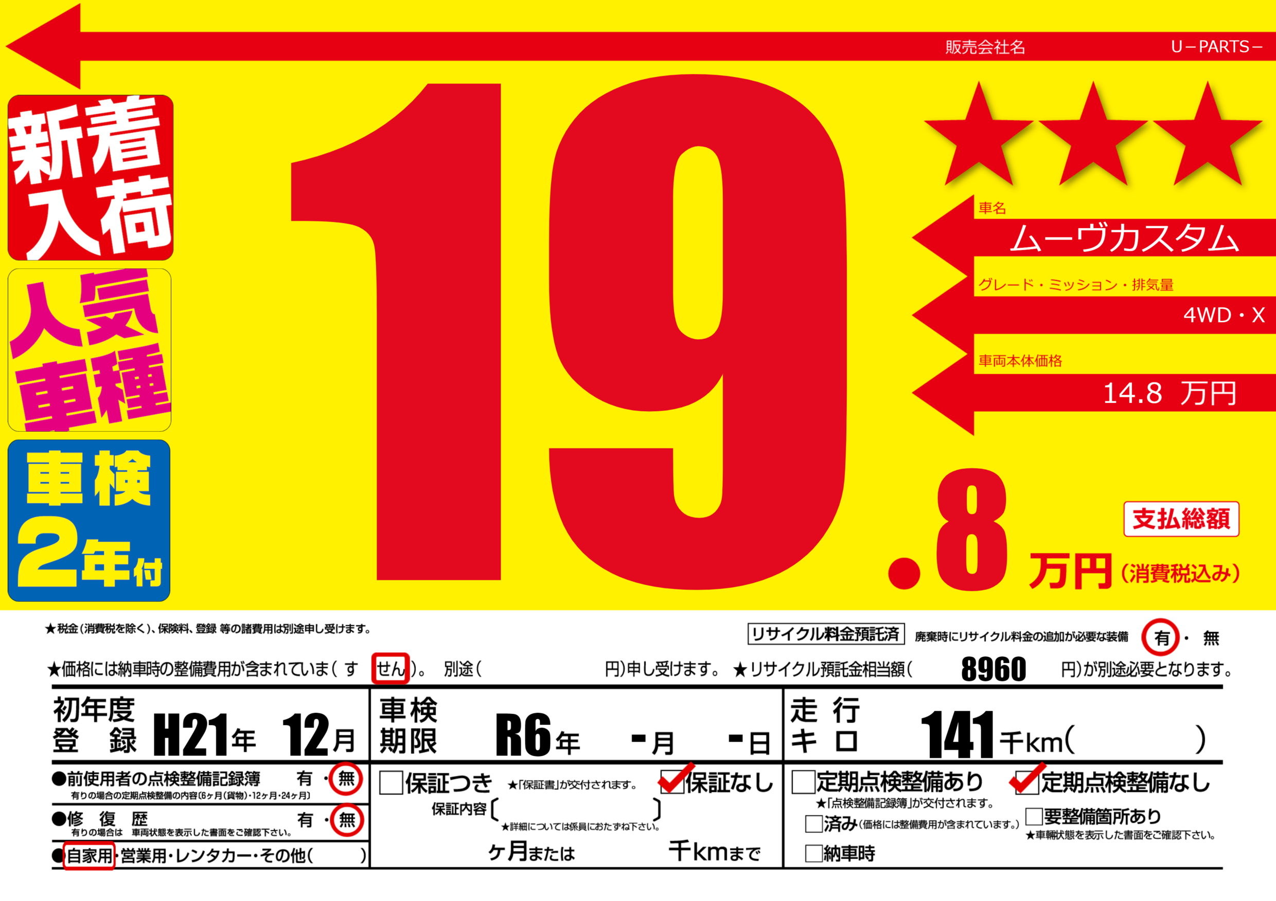 | 走行キロ | 14.1万km | 初年度登録 | H21年12月 |