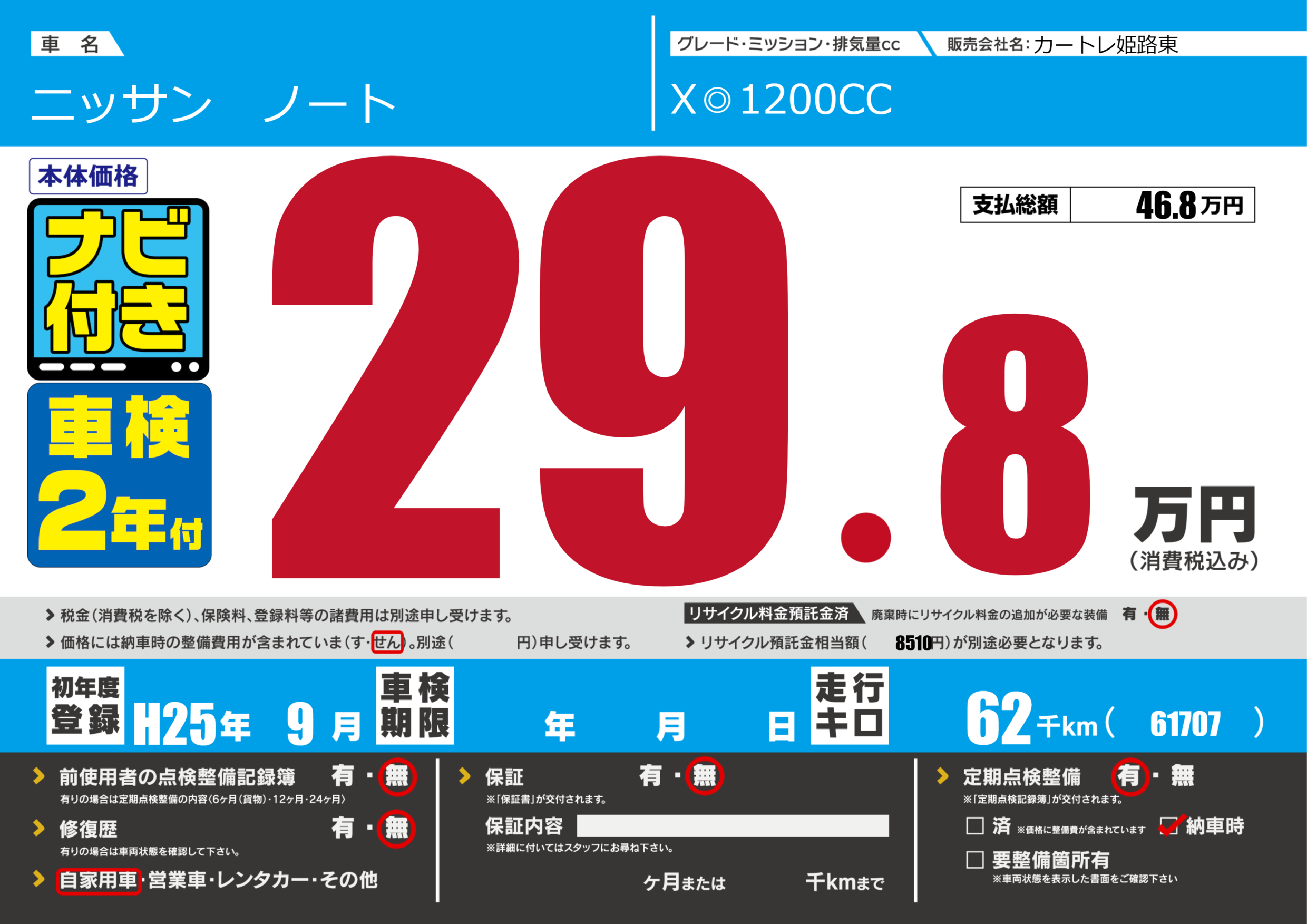 | 車名 | ニッサン ノート | グレード ミッション 排気量 |
